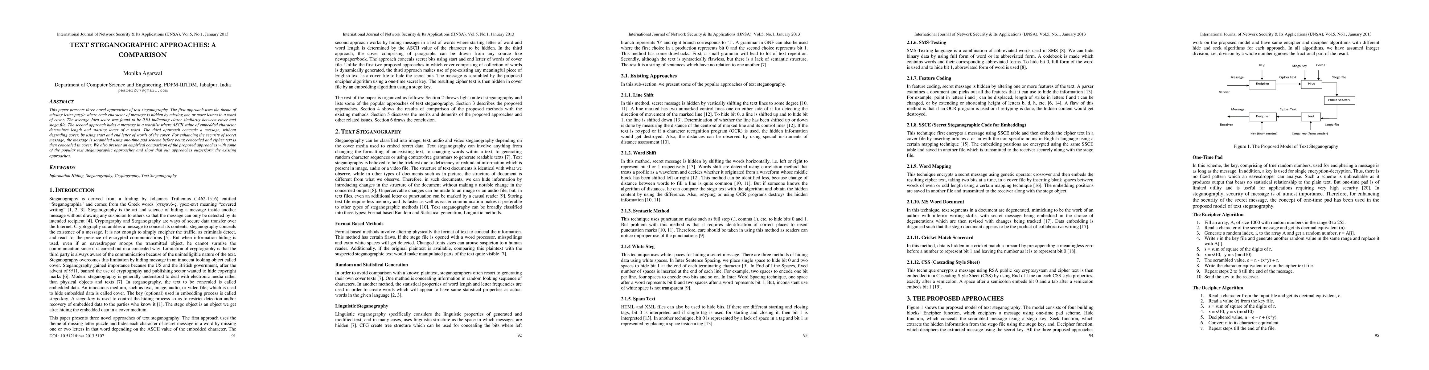 The paper proposes three novel text steganography approaches that outperform existing methods, including a missing letter puzzle approach with a high Jaro score of 0.95 and an approach using ASCII values to hide messages in words.