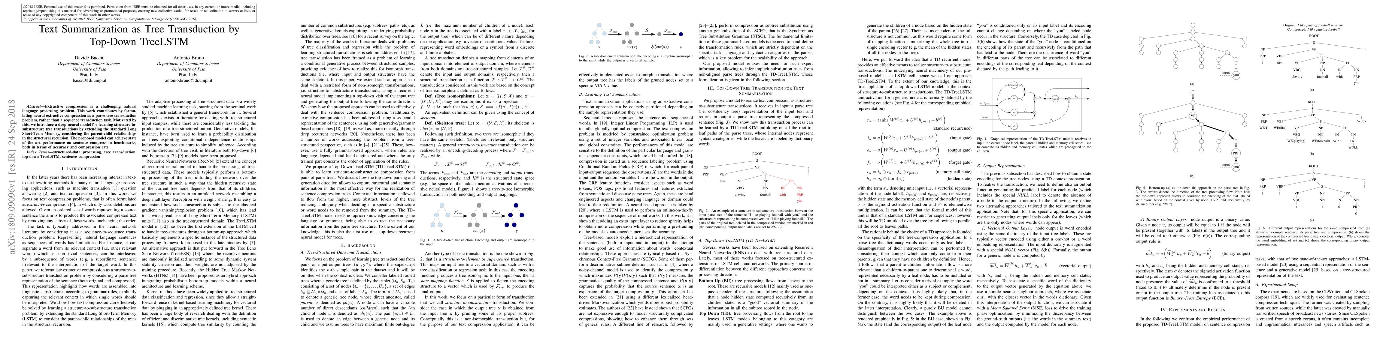 This paper proposes a new neural model for extractive text summarization that treats it as a parse tree transduction problem, leveraging a Top-Down TreeLSTM to consider parent-child relationships in structural recursion. The model achieves state-of-the-art performance on sentence compression benchmarks.
