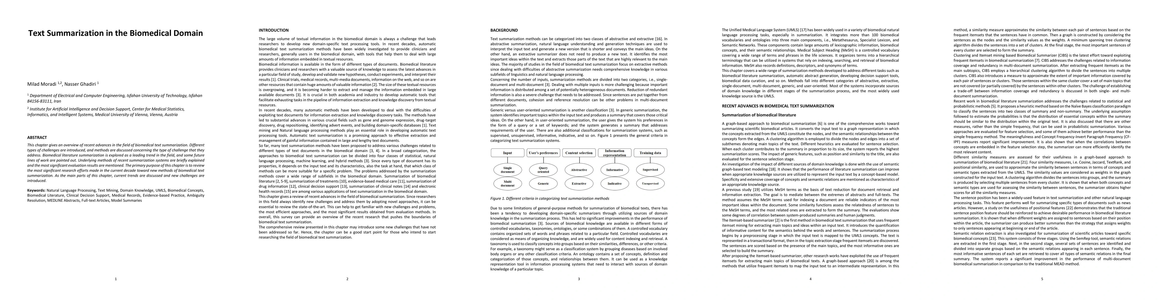 The paper provides an overview of recent advances in biomedical text summarization, discussing various methods and challenges, with a focus on summarization systems incorporating domain knowledge, particularly the UMLS.