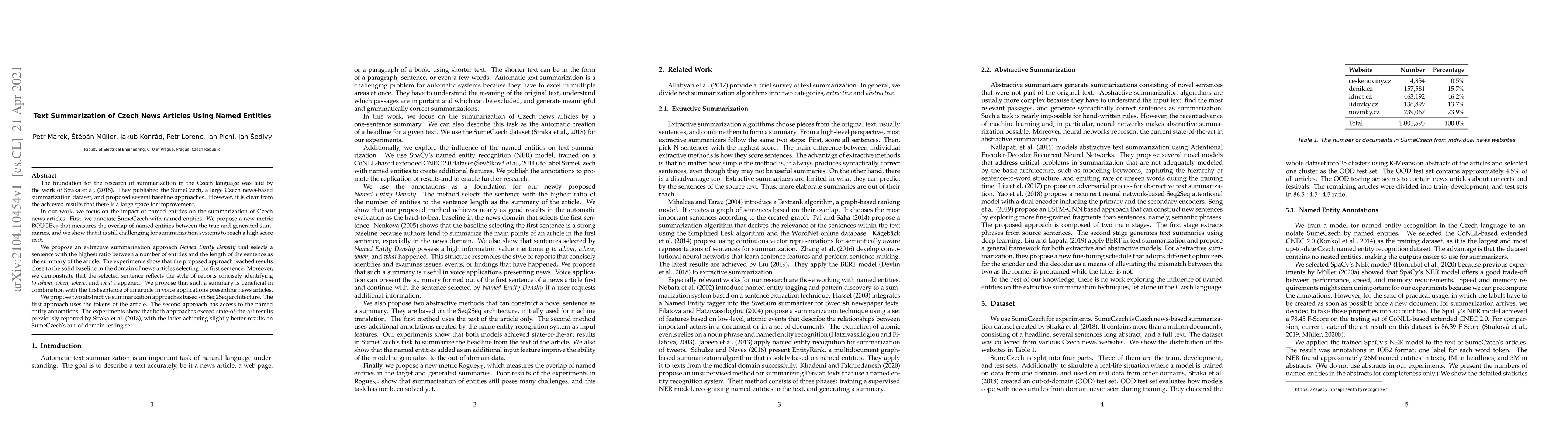 This work is novel in its use of sequence-to-sequence models for Czech news summarization and its application of NER techniques to improve accuracy