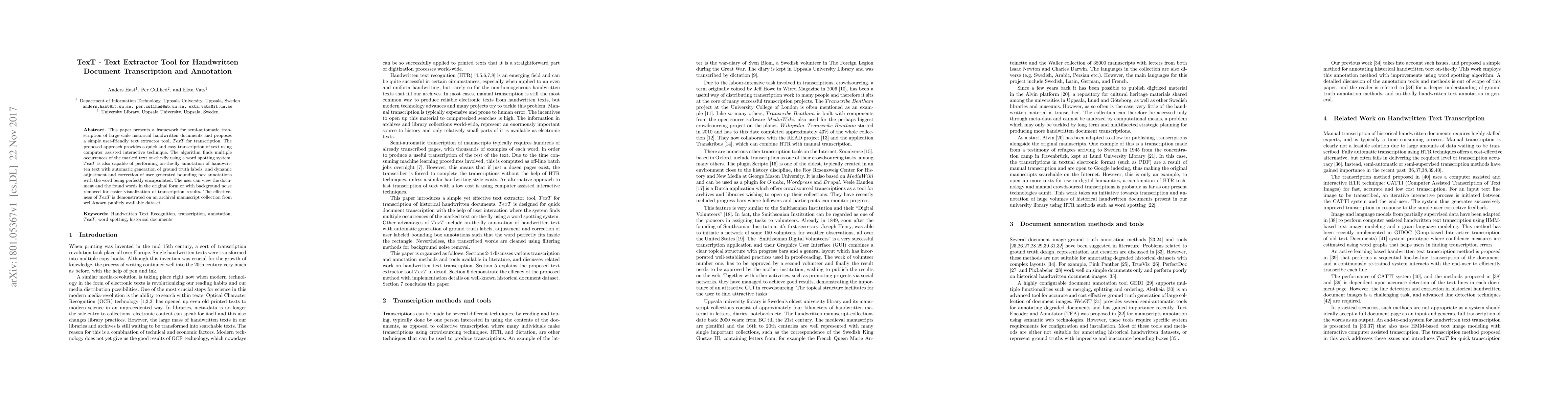 This paper introduces TexT, a semi-automatic tool for transcribing and annotating large-scale historical handwritten documents, utilizing computer-assisted interactive techniques and word spotting for efficient transcription. The tool also supports on-the-fly annotation and dynamic correction of user-generated annotations.