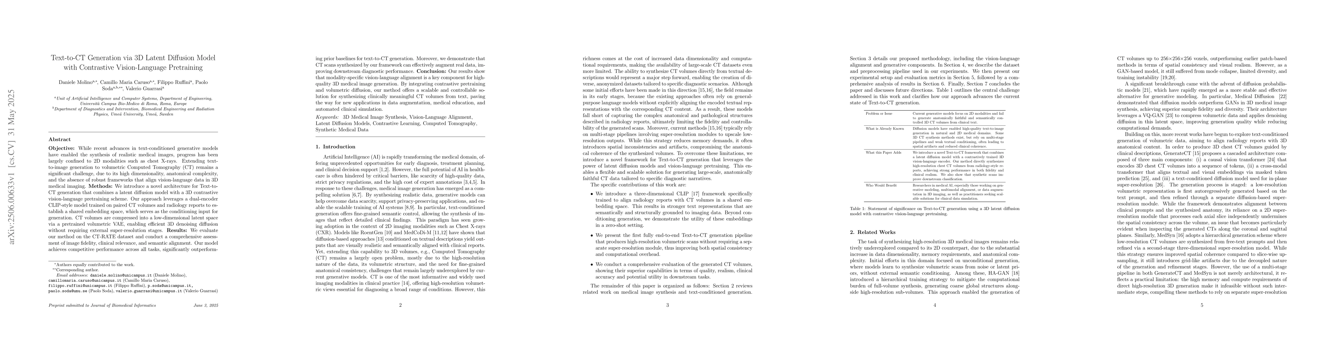The paper introduces a novel architecture for Text-to-CT generation combining a latent diffusion model with a 3D contrastive vision-language pretraining scheme. It uses a dual-encoder CLIP-style model trained on paired CT volumes and radiology reports, and a pretrained volumetric VAE for latent compression.