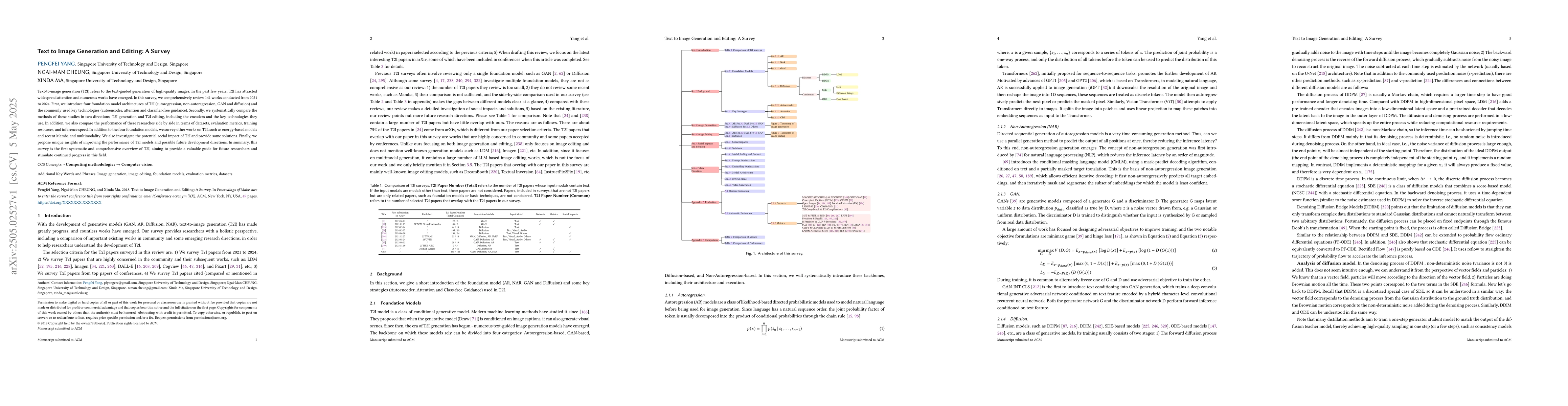 Text-to-image generation (T2I) refers to the text-guided generation of high-quality images. In the past few years, T2I has attracted widespread attention and numerous works have emerged. In this survey, we comprehensively review 141 works conducted from 2021 to 2024. First, we introduce four foundation model architectures of T2I (autoregression, non-autoregression, GAN and diffusion) and the commonly used key technologies (autoencoder, attention and classifier-free guidance). Secondly, we systematically compare the methods of these studies in two directions, T2I generation and T2I editing, including the encoders and the key technologies they use. In addition, we also compare the performance of these researches side by side in terms of datasets, evaluation metrics, training resources, and inference speed. In addition to the four foundation models, we survey other works on T2I, such as energy-based models and recent Mamba and multimodality. We also investigate the potential social impact of T2I and provide some solutions. Finally, we propose unique insights of improving the performance of T2I models and possible future development directions. In summary, this survey is the first systematic and comprehensive overview of T2I, aiming to provide a valuable guide for future researchers and stimulate continued progress in this field.