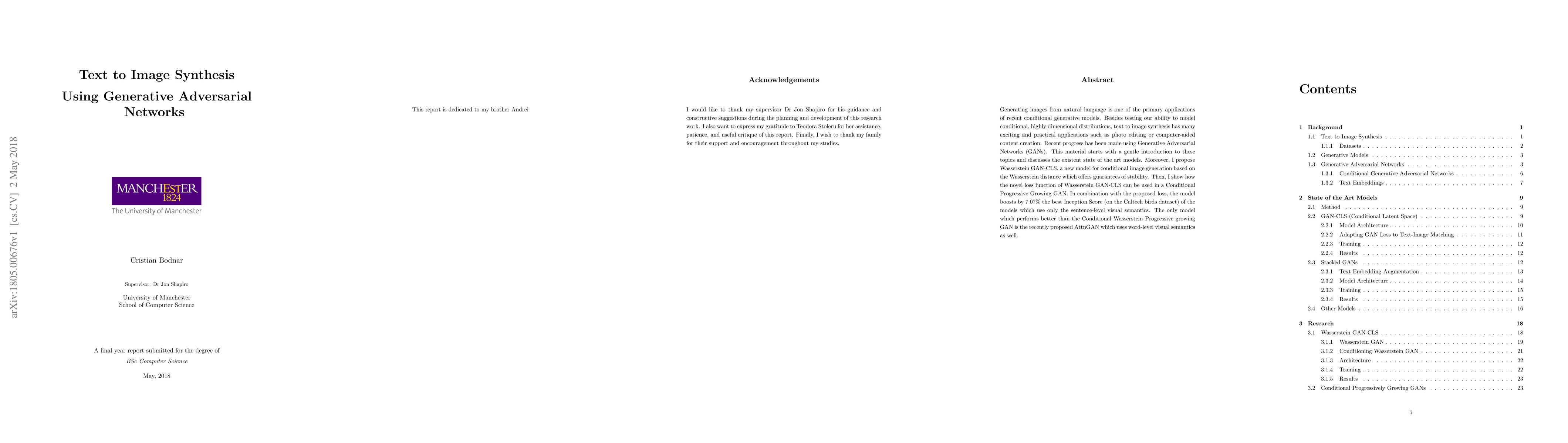 Generating images from natural language is one of the primary applications of recent conditional generative models. Besides testing our ability to model conditional, highly dimensional distributions, text to image synthesis has many exciting and practical applications such as photo editing or computer-aided content creation. Recent progress has been made using Generative Adversarial Networks (GANs). This material starts with a gentle introduction to these topics and discusses the existent state of the art models. Moreover, I propose Wasserstein GAN-CLS, a new model for conditional image generation based on the Wasserstein distance which offers guarantees of stability. Then, I show how the novel loss function of Wasserstein GAN-CLS can be used in a Conditional Progressive Growing GAN. In combination with the proposed loss, the model boosts by 7.07% the best Inception Score (on the Caltech birds dataset) of the models which use only the sentence-level visual semantics. The only model which performs better than the Conditional Wasserstein Progressive Growing GAN is the recently proposed AttnGAN which uses word-level visual semantics as well.