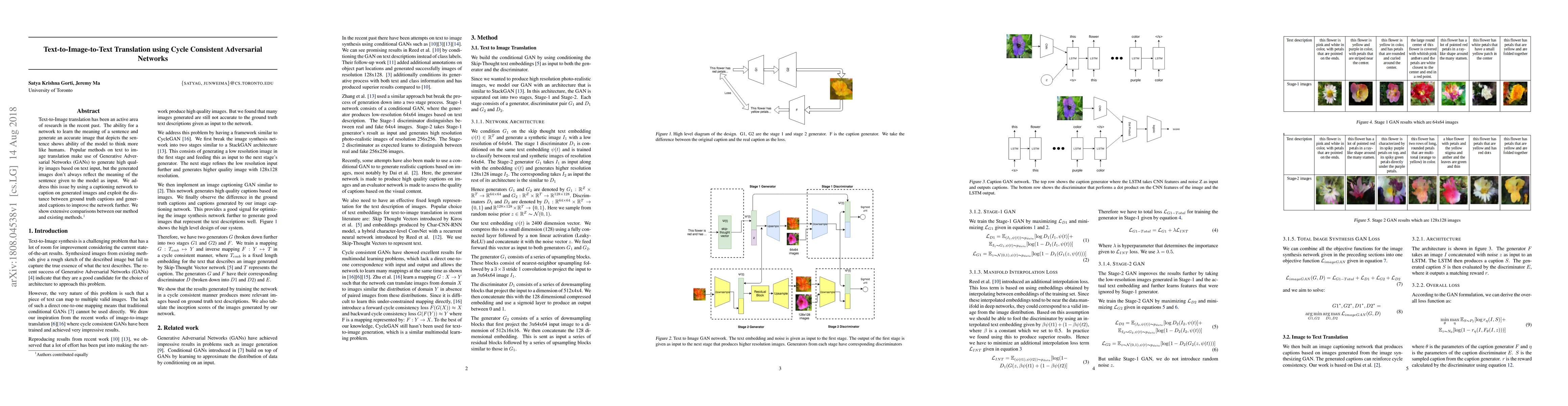 Text-to-Image translation has been an active area of research in the recent past. The ability for a network to learn the meaning of a sentence and generate an accurate image that depicts the sentence shows ability of the model to think more like humans. Popular methods on text to image translation make use of Generative Adversarial Networks (GANs) to generate high quality images based on text input, but the generated images don't always reflect the meaning of the sentence given to the model as input. We address this issue by using a captioning network to caption on generated images and exploit the distance between ground truth captions and generated captions to improve the network further. We show extensive comparisons between our method and existing methods.