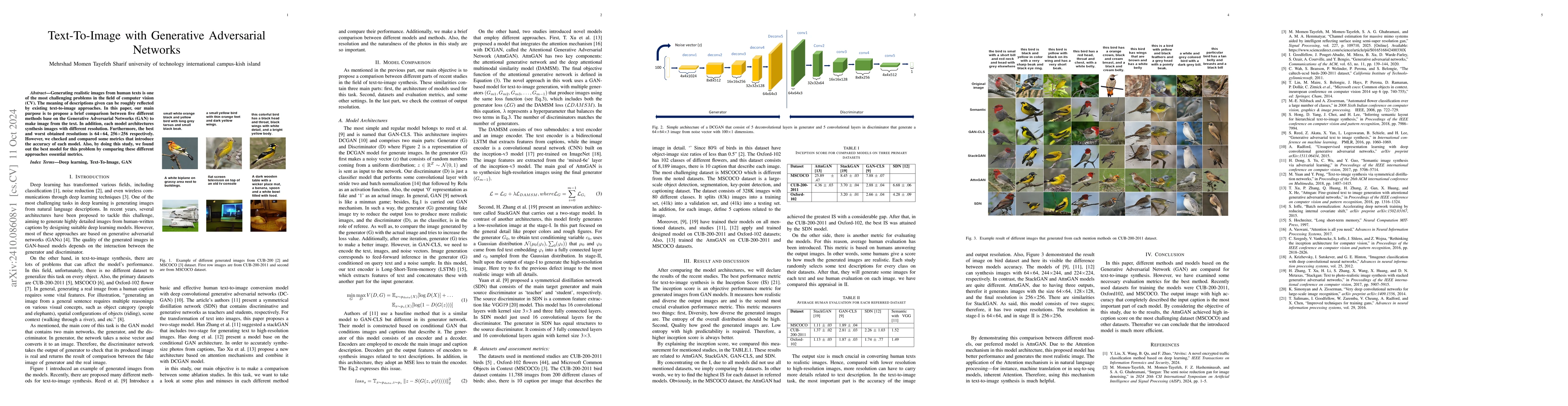 This paper compares five GAN-based methods for generating realistic images from text descriptions, evaluating them based on resolution and accuracy metrics to determine the best approach for text-to-image conversion. The best resolution achieved is 256*256, while the worst is 64*64.