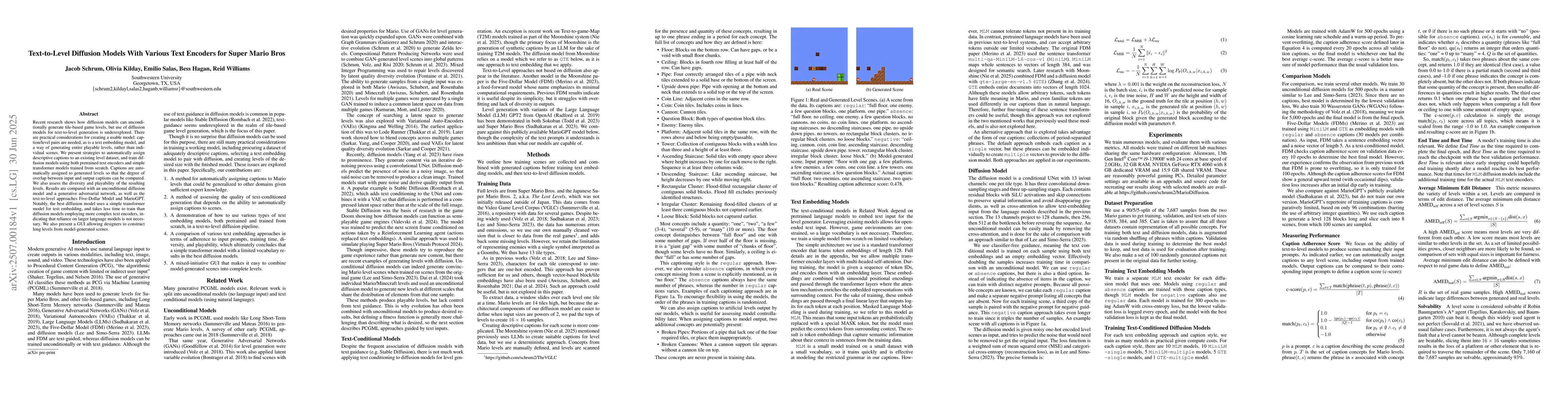 Recent research shows how diffusion models can unconditionally generate tile-based game levels, but use of diffusion models for text-to-level generation is underexplored. There are practical considerations for creating a usable model: caption/level pairs are needed, as is a text embedding model, and a way of generating entire playable levels, rather than individual scenes. We present strategies to automatically assign descriptive captions to an existing level dataset, and train diffusion models using both pretrained text encoders and simple transformer models trained from scratch. Captions are automatically assigned to generated levels so that the degree of overlap between input and output captions can be compared. We also assess the diversity and playability of the resulting levels. Results are compared with an unconditional diffusion model and a generative adversarial network, as well as the text-to-level approaches Five-Dollar Model and MarioGPT. Notably, the best diffusion model uses a simple transformer model for text embedding, and takes less time to train than diffusion models employing more complex text encoders, indicating that reliance on larger language models is not necessary. We also present a GUI allowing designers to construct long levels from model-generated scenes.