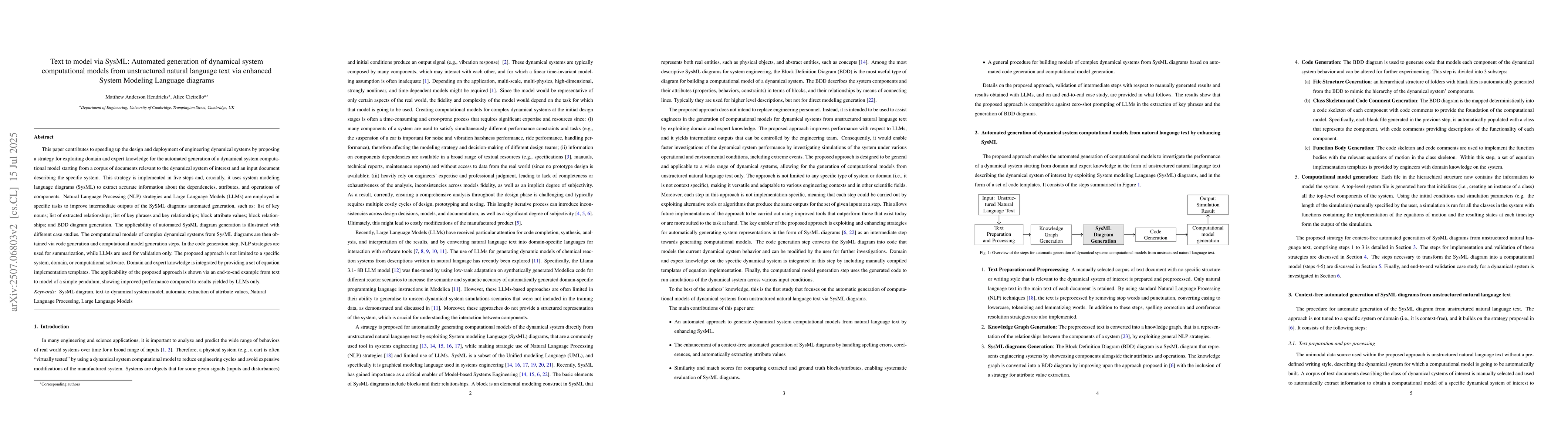 This paper contributes to speeding up the design and deployment of engineering dynamical systems by proposing a strategy for exploiting domain and expert knowledge for the automated generation of dynamical system computational model starting from a corpus of document relevant to the dynamical system of interest and an input document describing the specific system. This strategy is implemented in five steps and, crucially, it uses system modeling language diagrams (SysML) to extract accurate information about the dependencies, attributes, and operations of components. Natural Language Processing (NLP) strategies and Large Language Models (LLMs) are employed in specific tasks to improve intermediate outputs of the SySML diagrams automated generation, such as: list of key nouns; list of extracted relationships; list of key phrases and key relationships; block attribute values; block relationships; and BDD diagram generation. The applicability of automated SysML diagram generation is illustrated with different case studies. The computational models of complex dynamical systems from SysML diagrams are then obtained via code generation and computational model generation steps. In the code generation step, NLP strategies are used for summarization, while LLMs are used for validation only. The proposed approach is not limited to a specific system, domain, or computational software. The applicability of the proposed approach is shown via an end-to-end example from text to model of a simple pendulum, showing improved performance compared to results yielded by LLMs only.