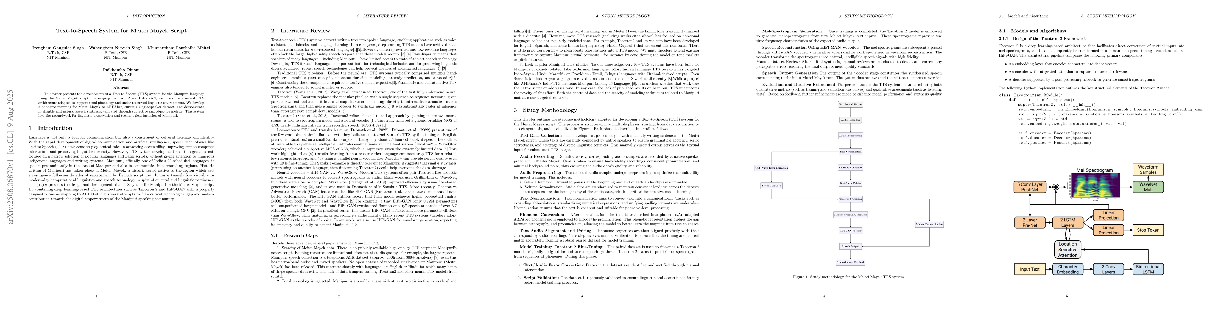 The research developed a Text-to-Speech (TTS) system for the Manipuri language using the Meitei Mayek script, adapting Tacotron 2 and HiFi-GAN for tonal phonology and under-resourced linguistic environments. A phoneme mapping from Meitei Mayek to ARPAbet was created, and a single-speaker dataset was curated for training.