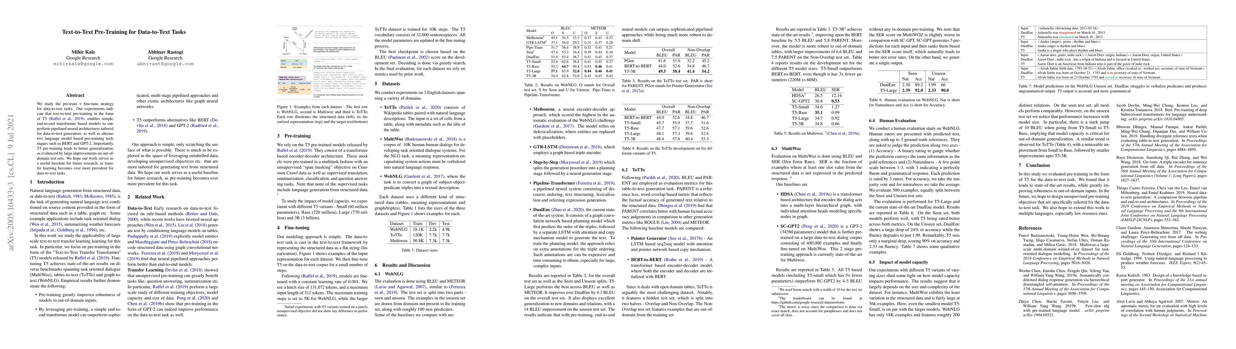 We study the pre-train + fine-tune strategy for data-to-text tasks. Our experiments indicate that text-to-text pre-training in the form of T5, enables simple, end-to-end transformer based models to outperform pipelined neural architectures tailored for data-to-text generation, as well as alternative language model based pre-training techniques such as BERT and GPT-2. Importantly, T5 pre-training leads to better generalization, as evidenced by large improvements on out-of-domain test sets. We hope our work serves as a useful baseline for future research, as transfer learning becomes ever more prevalent for data-to-text tasks.