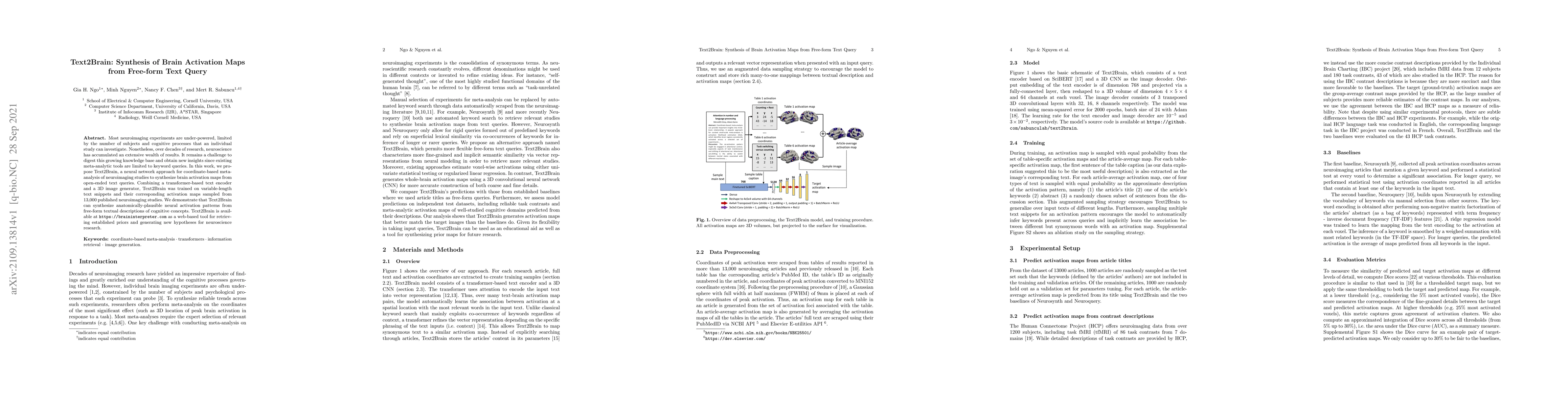 Text2Brain synthesizes brain activation maps from free-form text queries using a neural network combining a transformer-based text encoder and a 3D image generator, enabling coordinate-based meta-analysis of neuroimaging studies. The tool is available online to retrieve prior knowledge and generate new neuroscience hypotheses.
