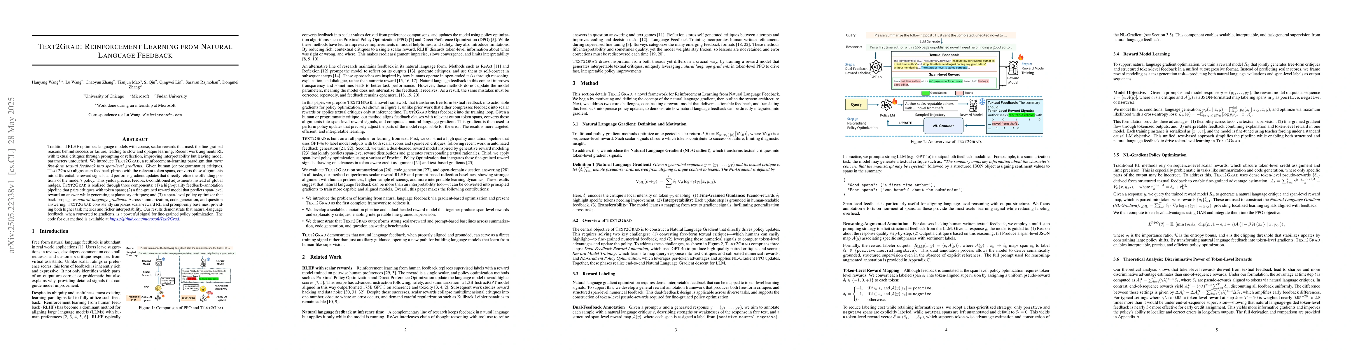 Text2Grad's main technical contribution is the conversion of natural-language feedback into differentiable reward signals for gradient-based policy updates.
