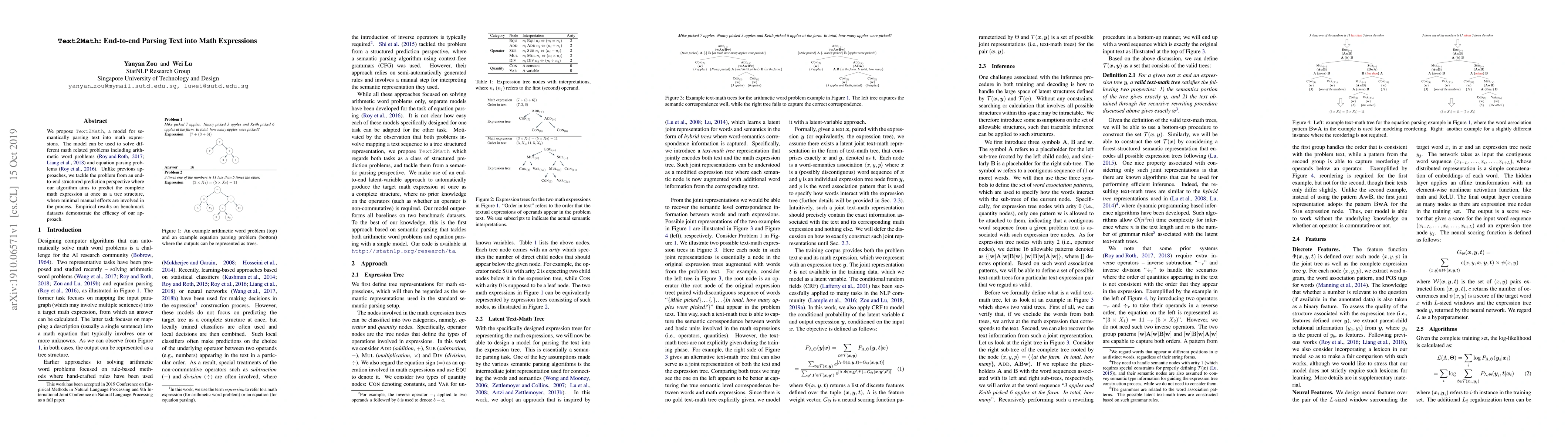 Summary: Text2Math is a novel model that converts text into math expressions through end-to-end parsing, offering a structured prediction approach to generate complete math expressions as tree structures, which is shown to be effective in solving arithmetic word problems and equation parsing.