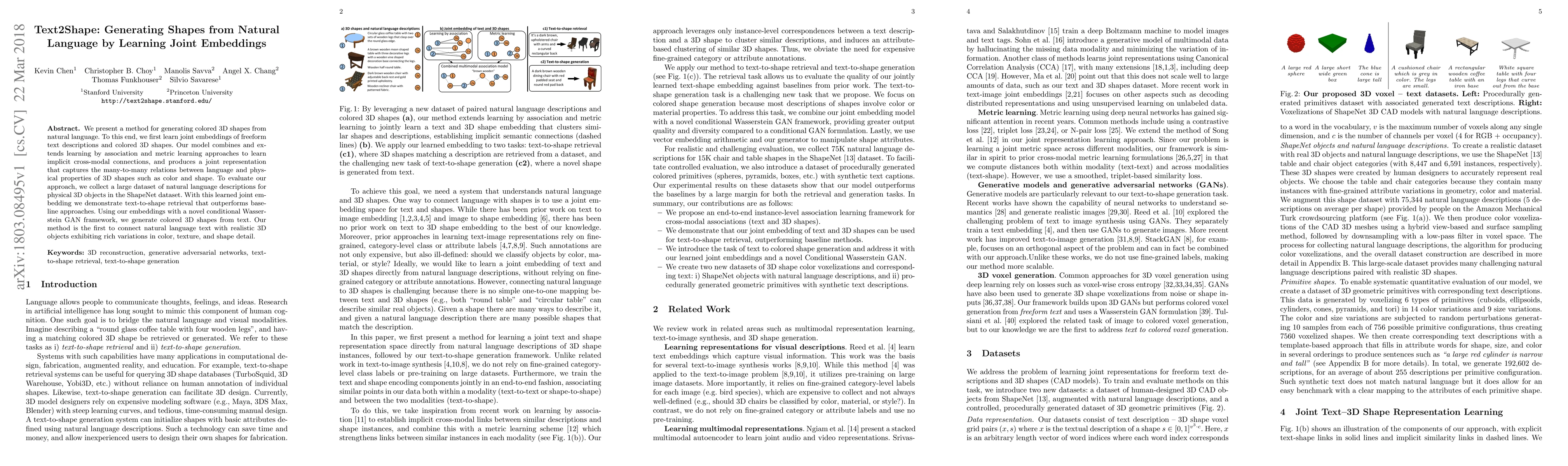 The research presents Text2Shape, a method for generating colored 3D shapes from natural language by learning joint embeddings of freeform text descriptions and colored 3D shapes. The model combines learning by association and metric learning approaches to create a joint representation capturing many-to-many relations between language and physical properties of 3D shapes, such as color and shape.