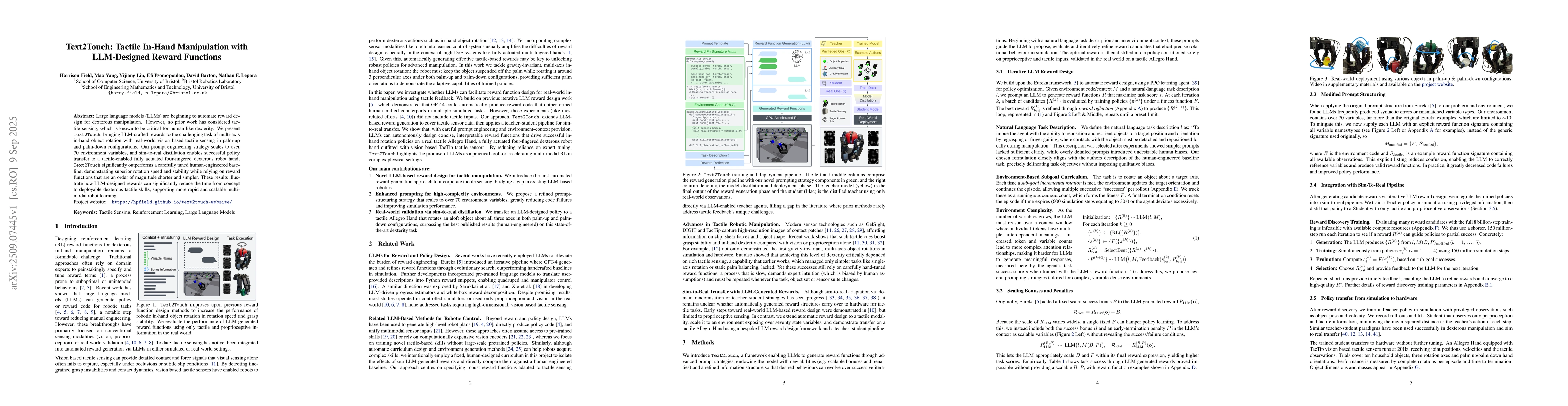Large language models (LLMs) are beginning to automate reward design for dexterous manipulation. However, no prior work has considered tactile sensing, which is known to be critical for human-like dexterity. We present Text2Touch, bringing LLM-crafted rewards to the challenging task of multi-axis in-hand object rotation with real-world vision based tactile sensing in palm-up and palm-down configurations. Our prompt engineering strategy scales to over 70 environment variables, and sim-to-real distillation enables successful policy transfer to a tactile-enabled fully actuated four-fingered dexterous robot hand. Text2Touch significantly outperforms a carefully tuned human-engineered baseline, demonstrating superior rotation speed and stability while relying on reward functions that are an order of magnitude shorter and simpler. These results illustrate how LLM-designed rewards can significantly reduce the time from concept to deployable dexterous tactile skills, supporting more rapid and scalable multimodal robot learning. Project website: https://hpfield.github.io/text2touch-website