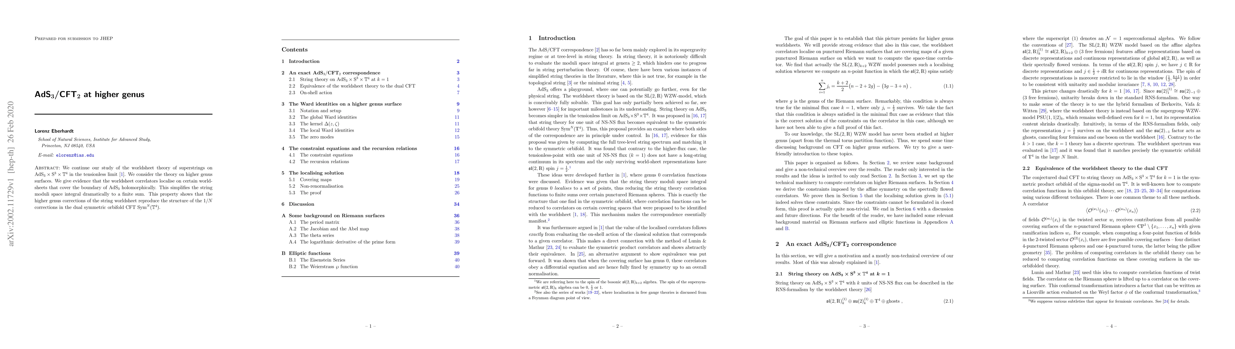 We continue our study of the worldsheet theory of superstrings on $\mathrm{AdS}_3 \times \mathrm{S}^3 \times \mathbb{T}^4$ in the tensionless limit arXiv:1911.00378. We consider the theory on higher genus surfaces. We give evidence that the worldsheet correlators localise on certain worldsheets that cover the boundary of $\mathrm{AdS}_3$ holomorphically. This simplifies the string moduli space integral dramatically to a finite sum. This property shows that the higher genus corrections of the string worldsheet reproduce the structure of the $1/N$ corrections in the dual symmetric orbifold CFT $\mathrm{Sym}^N(\mathbb{T}^4)$.