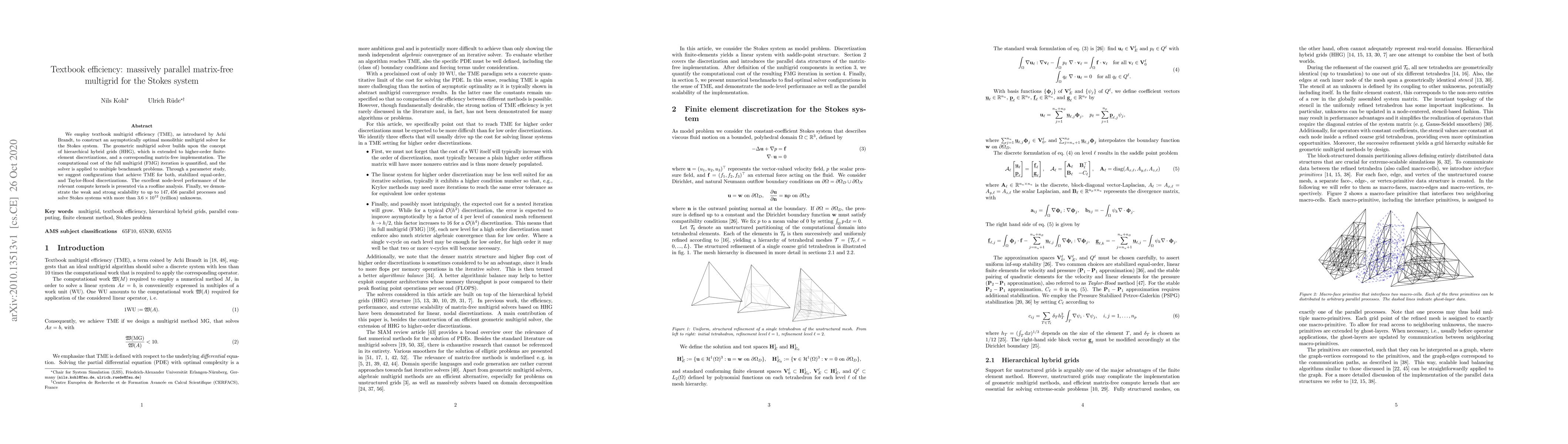 This paper develops a matrix-free multigrid solver for the Stokes system using textbook multigrid efficiency, achieving optimal performance through hierarchical hybrid grids and parallel computing. The solver demonstrates scalability to over 147,000 parallel processes and solves large-scale problems efficiently.