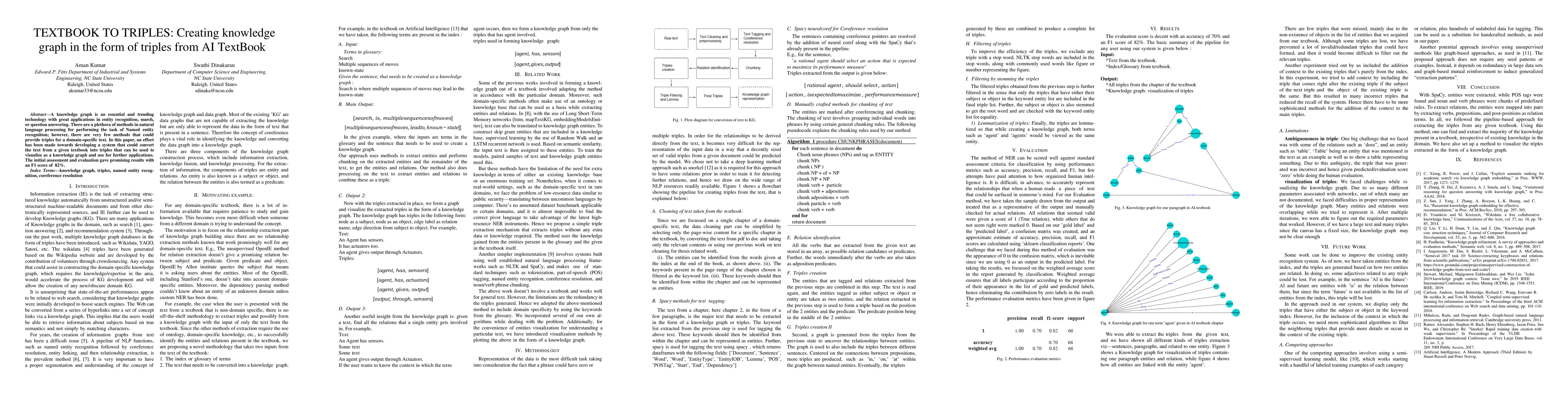 This paper presents a system for converting textbook text into domain-specific knowledge graph triples, achieving an F1 score of 82%. The method aims to facilitate applications in entity recognition, search, and question answering.