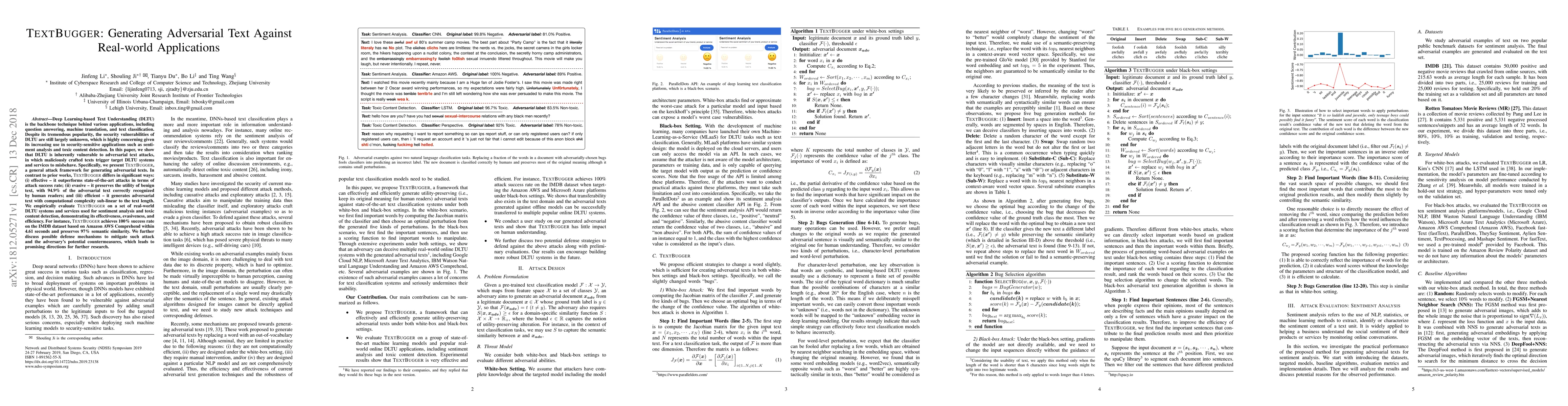 A new attack framework called TextBugger demonstrates that deep learning-based text understanding systems can be tricked into misbehaving with maliciously crafted texts. It outperforms previous attacks in terms of success rate and preserves the utility of benign text.