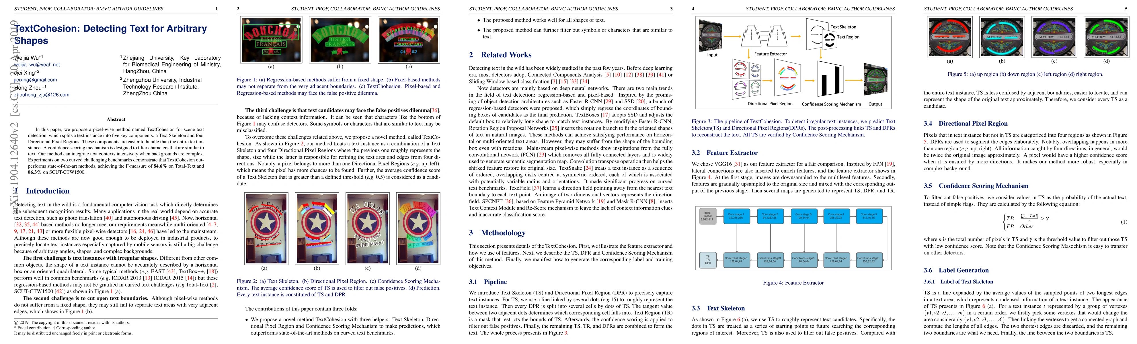 A new method called TextCohesion detects text with arbitrary shapes more accurately than existing methods, achieving high F-measure scores on challenging benchmarks.