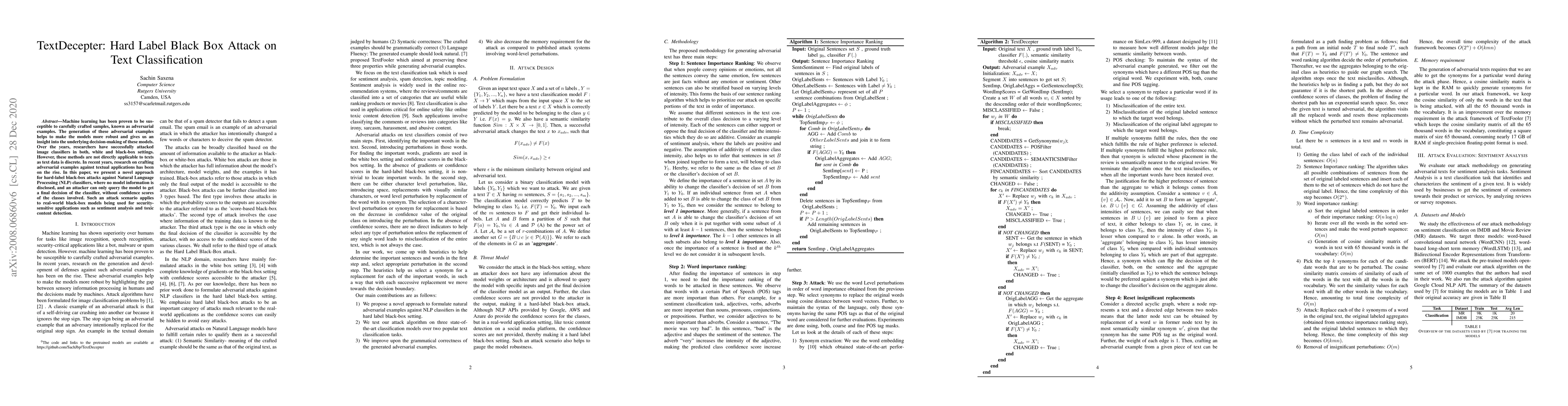 This paper presents TextDecepter, a novel method for generating adversarial examples to perform hard-label black-box attacks on NLP classifiers without access to model details, focusing on security-sensitive applications like sentiment analysis and toxic content detection. The approach aims to enhance model robustness and reveal underlying decision-making processes.