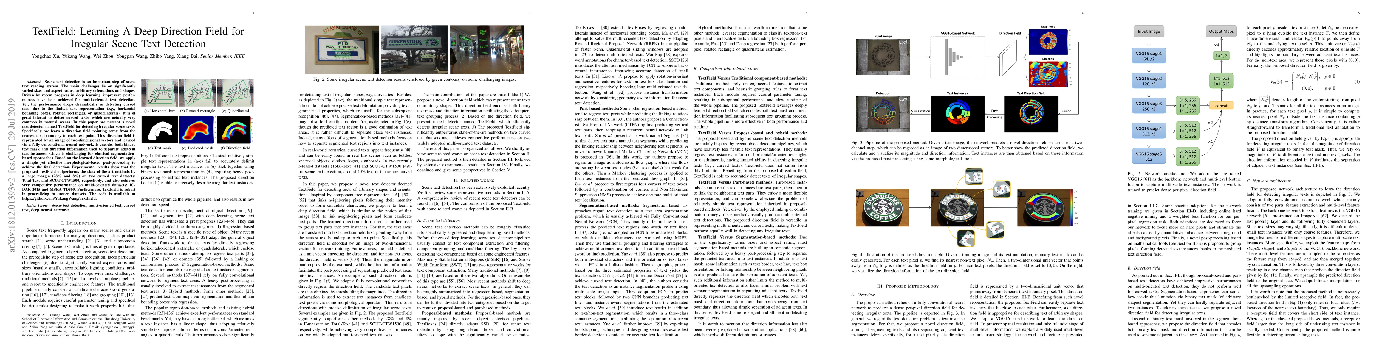 A novel text detector called TextField detects irregular scene texts by learning a direction field pointing away from each text point, outperforming state-of-the-art methods on curved text datasets.