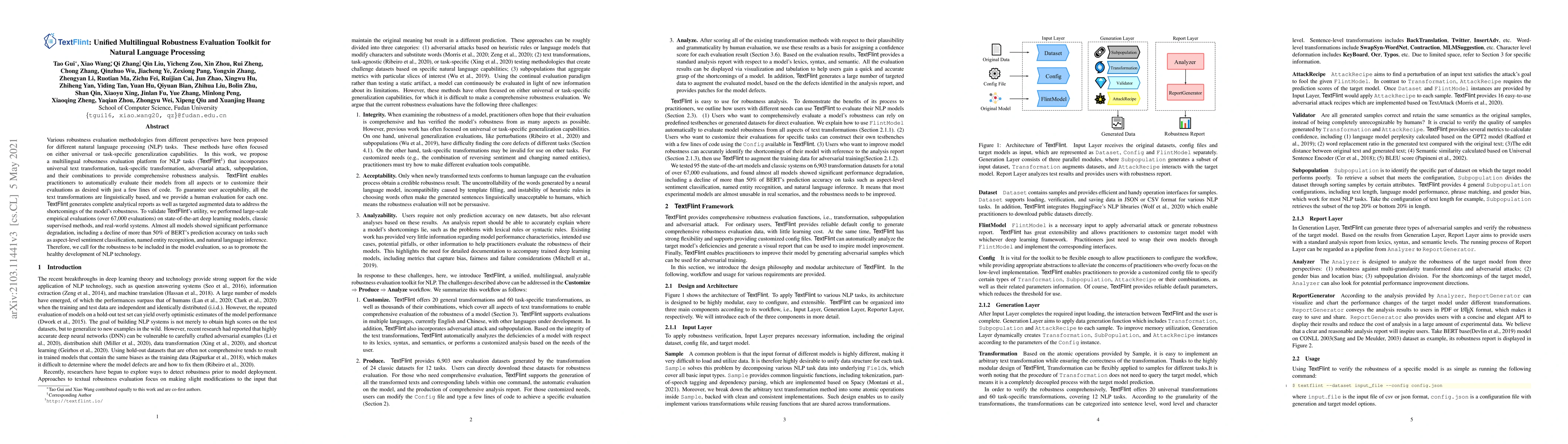 TextFlint is a multilingual robustness evaluation toolkit for NLP that combines universal and task-specific transformations, adversarial attacks, and subpopulation analyses to provide comprehensive model robustness assessments. It facilitates large-scale evaluations and highlights significant performance drops across various models, underscoring the need for robustness in NLP model evaluation.