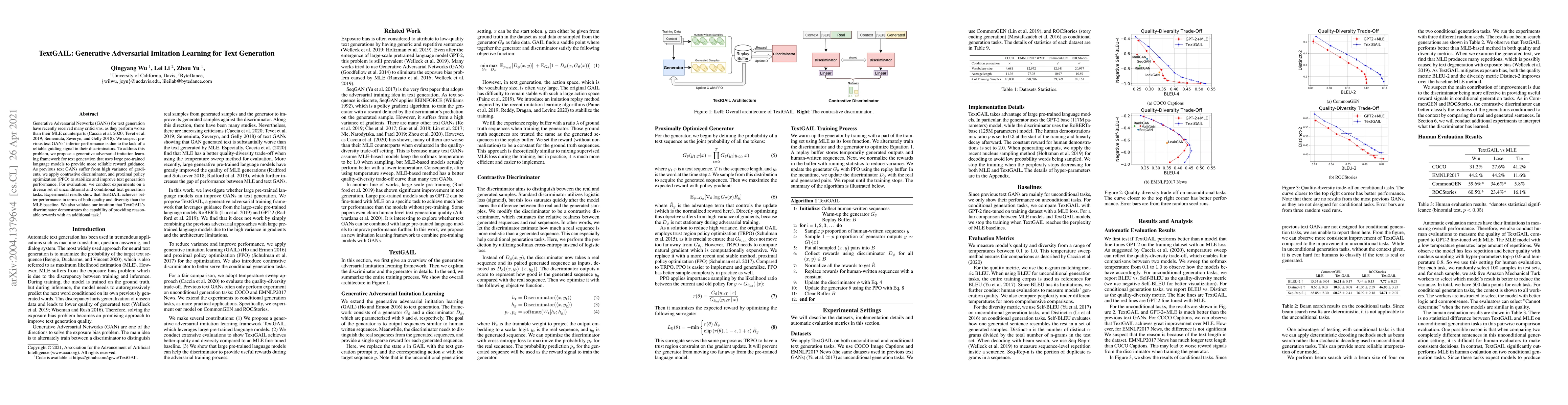 TextGAIL employs Generative Adversarial Imitation Learning to enhance text generation, using pre-trained language models to guide discriminator rewards. Experiments show improved performance over Maximum Likelihood Estimation baselines in both quality and diversity.