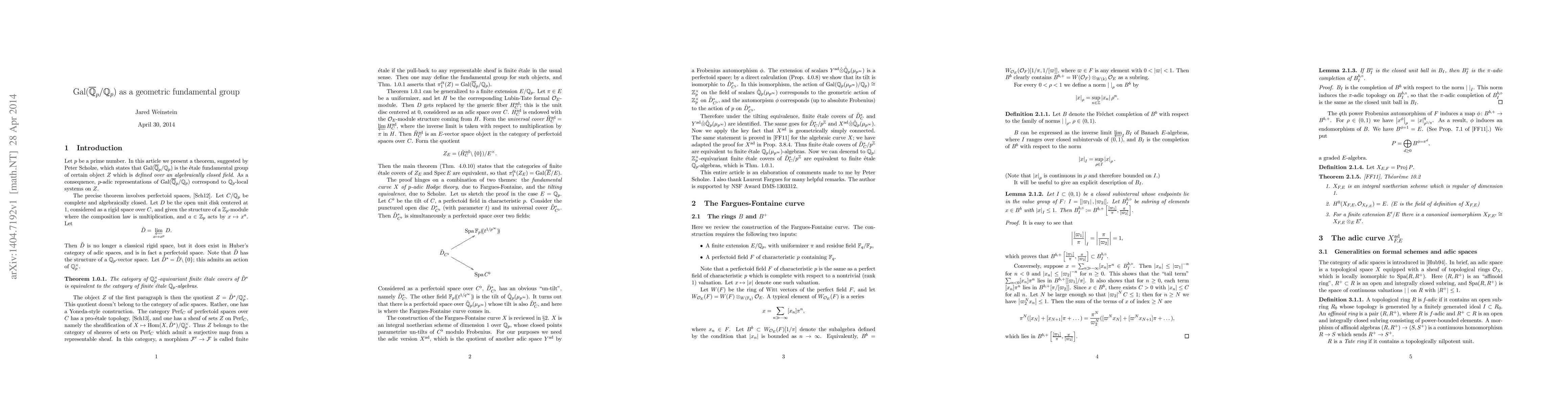This paper, inspired by Peter Scholze, proposes that the absolute Galois group of the field of $p$-adic numbers, $ ext{Gal}(overline{mathbf{Q}}_p/mathbf{Q}_p)$, corresponds to the etale fundamental group of a specific object $Z$. This object $Z$ is a quotient of a perfectoid space, integrating concepts from Fargues-Fontaine's fundamental curve in $p$-adic Hodge theory and Scholze's tilting equivalence. Essentially, this theorem equates local Galois representations with local systems on $Z$, suggesting a geometric interpretation of $p$-adic Galois groups.