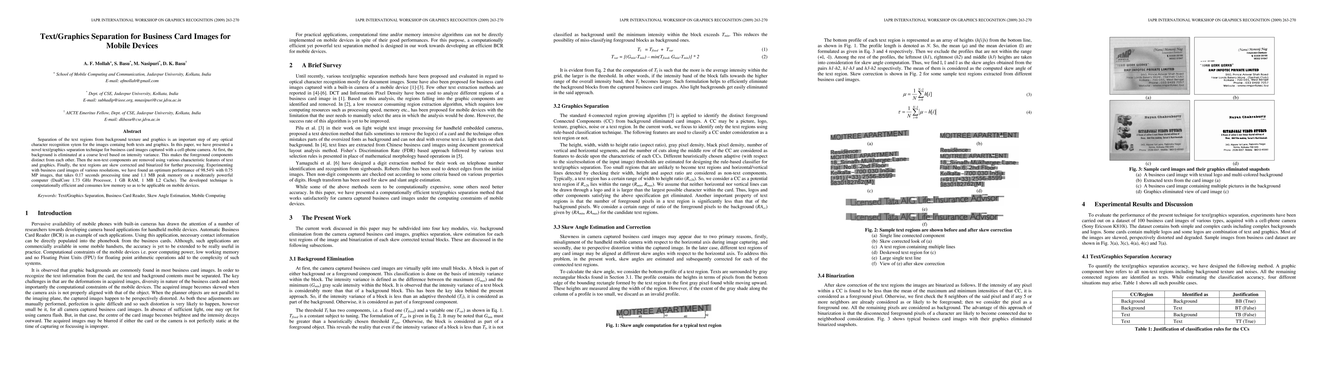 This paper presents a novel technique for separating text from graphics in business card images captured via mobile devices, achieving 98.54% accuracy with 0.75 MP images, while maintaining computational efficiency and low memory usage. The method involves coarse background elimination, non-text removal, and text skew correction.