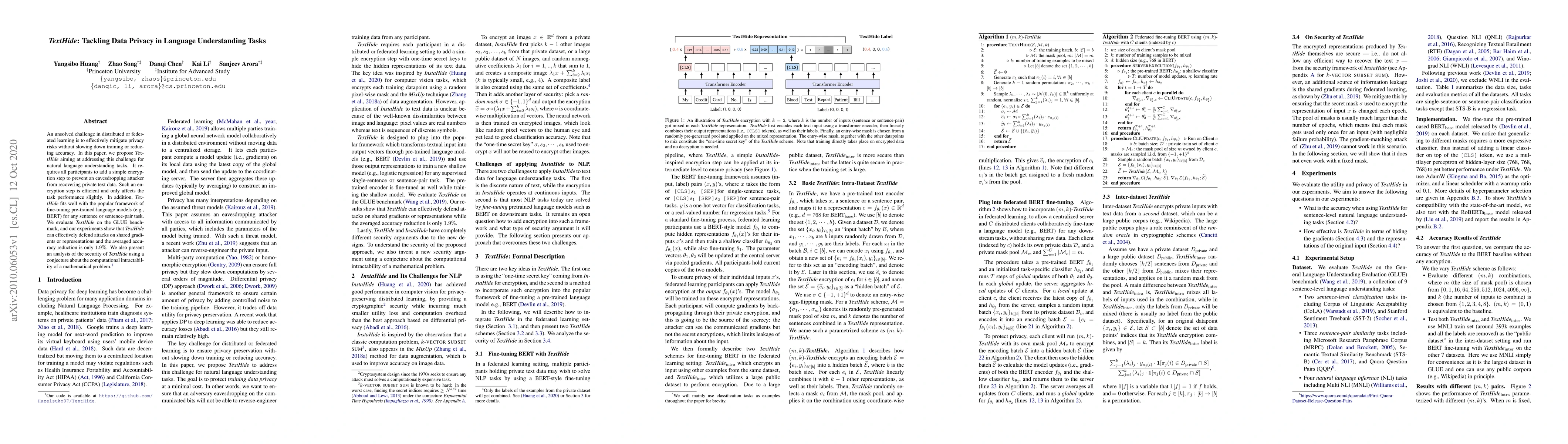 An unsolved challenge in distributed or federated learning is to effectively mitigate privacy risks without slowing down training or reducing accuracy. In this paper, we propose TextHide aiming at addressing this challenge for natural language understanding tasks. It requires all participants to add a simple encryption step to prevent an eavesdropping attacker from recovering private text data. Such an encryption step is efficient and only affects the task performance slightly. In addition, TextHide fits well with the popular framework of fine-tuning pre-trained language models (e.g., BERT) for any sentence or sentence-pair task. We evaluate TextHide on the GLUE benchmark, and our experiments show that TextHide can effectively defend attacks on shared gradients or representations and the averaged accuracy reduction is only $1.9\%$. We also present an analysis of the security of TextHide using a conjecture about the computational intractability of a mathematical problem. Our code is available at https://github.com/Hazelsuko07/TextHide