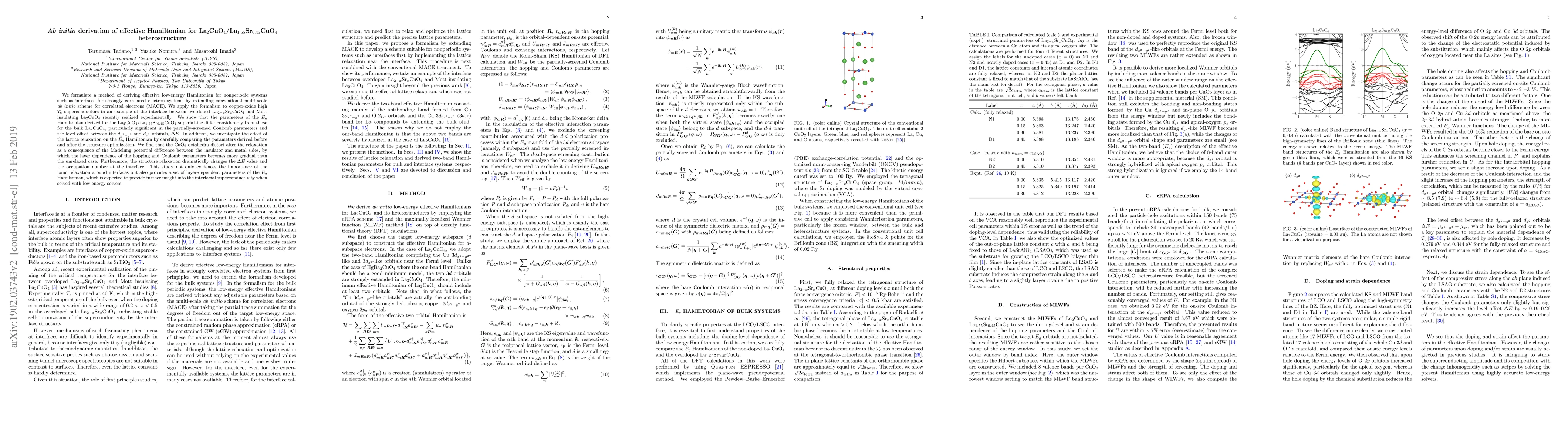 We formulate a method of deriving effective low-energy Hamiltonian for nonperiodic systems such as interfaces for strongly correlated electron systems by extending conventional multi-scale $\textit{ab initio}$ scheme for correlated electrons (MACE). We apply the formalism to copper-oxide high $T_{\rm c}$ superconductors in an example of the interface between overdoped La$_{2-x}$Sr$_{x}$CuO$_{4}$ and Mott insulating La$_{2}$CuO$_{4}$ recently realized experimentally. We show that the parameters of the $E_g$ Hamiltonian derived for the La$_{2}$CuO$_{4}$/La$_{1.55}$Sr$_{0.45}$CuO$_{4}$ superlattice differ considerably from those for the bulk La$_{2}$CuO$_{4}$, particularly significant in the partially-screened Coulomb parameters and the level offset between the $d_{x^{2}-y^{2}}$ and $d_{z^{2}}$ orbitals, $\Delta E$. In addition, we investigate the effect of the lattice relaxation on the $E_g$ Hamiltonian by carefully comparing the parameters derived before and after the structure optimization. We find that the CuO$_{6}$ octahedra distort after the relaxation as a consequence of the Madelung potential difference between the insulator and metal sides, by which the layer dependence of the hopping and Coulomb parameters becomes more gradual than the unrelaxed case. Furthermore, the structure relaxation dramatically changes the $\Delta E$ value and the occupation number at the interface. This study not only evidences the importance of the ionic relaxation around interfaces but also provides a set of layer-dependent parameters of the $E_g$ Hamiltonian, which is expected to provide further insight into the interfacial superconductivity when solved with low-energy solvers.