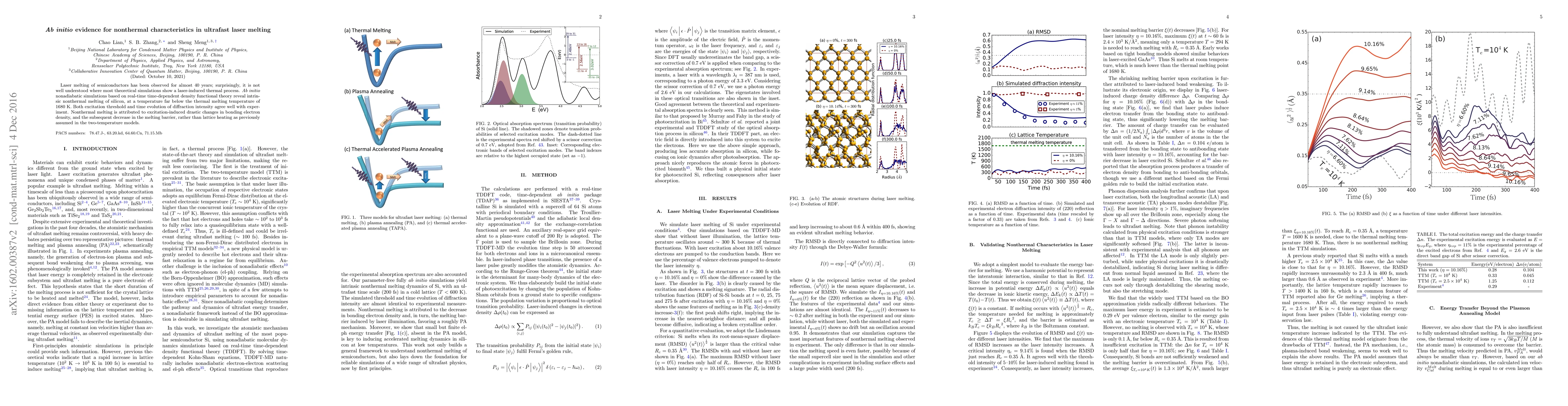 This paper uses $\textit{ab initio}$ simulations to demonstrate that ultrafast laser melting of silicon exhibits nonthermal characteristics, contradicting the thermal process assumed in previous models. The simulations reveal that melting occurs at a much lower temperature due to changes in bonding electron density, rather than lattice heating.