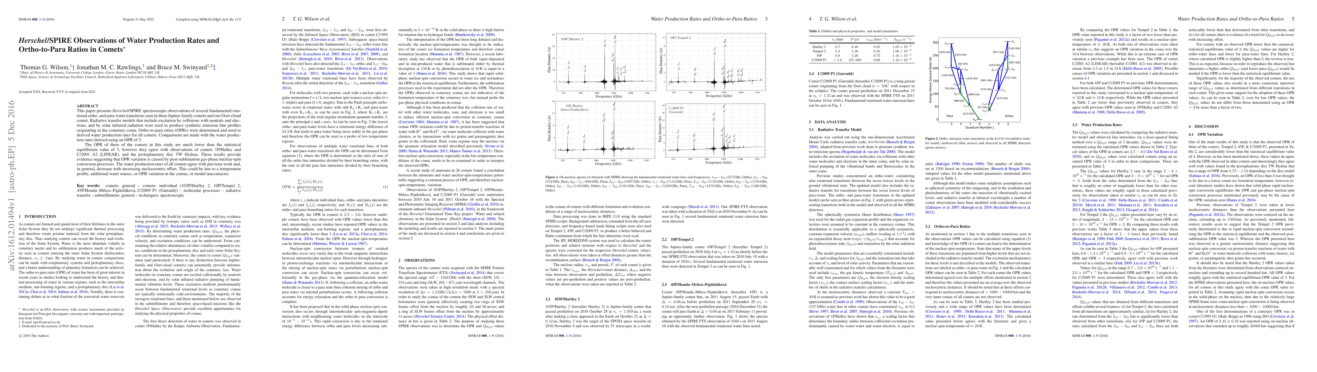 This study uses $\textit{Herschel}$/SPIRE observations to determine water production rates and ortho-to-para ratios (OPRs) in four comets, revealing that OPRs vary significantly from the equilibrium value of 3, suggesting gas-phase nuclear-spin conversion processes. The derived water production rates align with previous findings, showing a trend of decreasing rates with increasing distance from the nucleus.