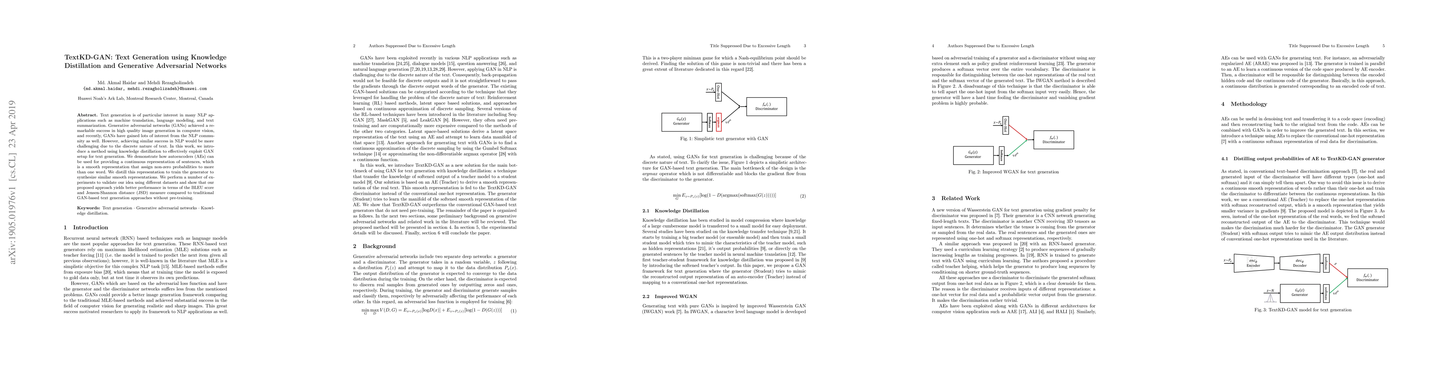 This paper introduces TextKD-GAN, a method combining knowledge distillation and GANs for text generation, leveraging autoencoders to provide continuous sentence representations. Experiments show improved performance in BLEU score and JSD compared to traditional GAN-based approaches.