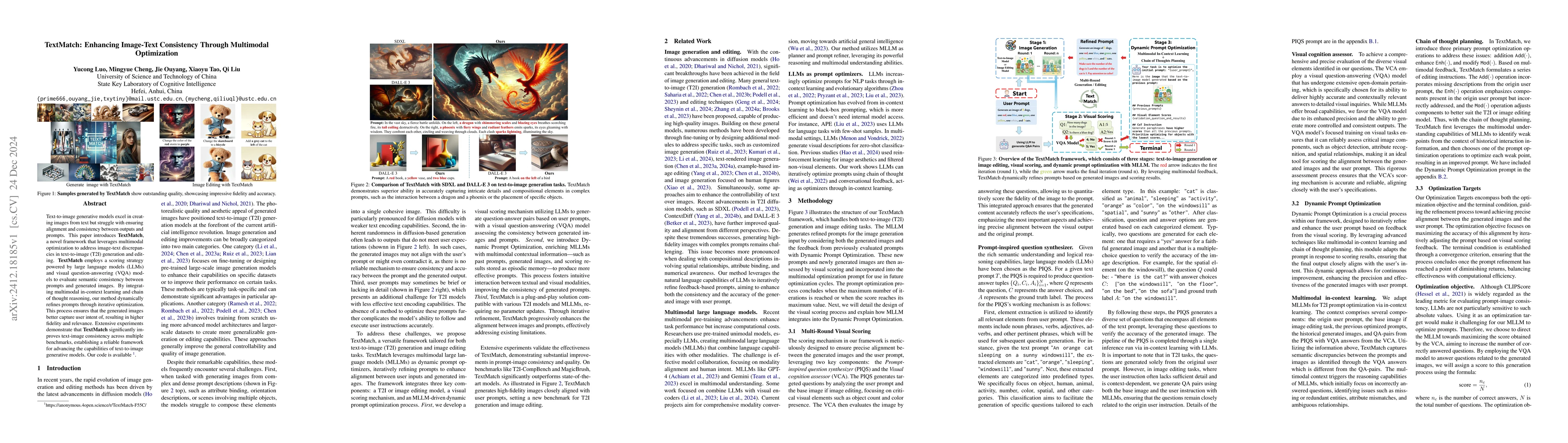 TextMatch introduces a framework that enhances image-text consistency in text-to-image generation by leveraging multimodal optimization, using LLMs and VQA models to refine prompts iteratively for better fidelity. Experiments show substantial improvements in text-image alignment across various benchmarks.