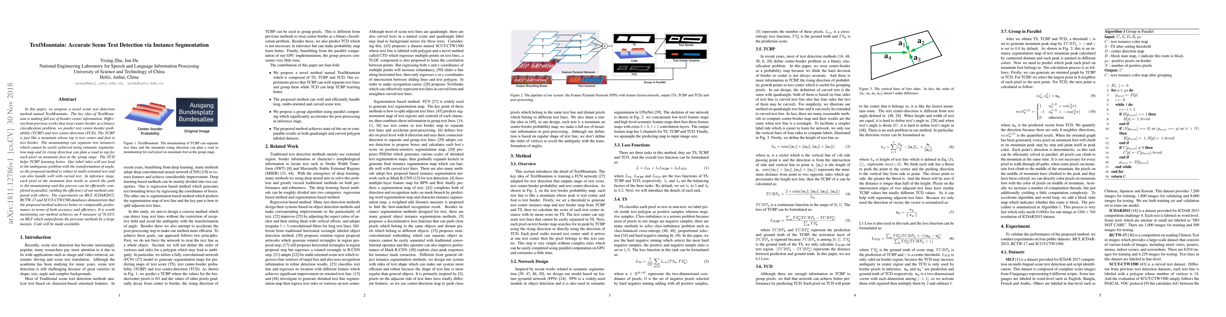 TextMountain proposes a novel scene text detection method utilizing instance segmentation to predict text center-border probability and text center-direction, achieving superior accuracy and efficiency compared to previous methods, especially for multi-oriented and curved text. The method's parallel search process in the inference stage enhances its performance on multiple datasets.