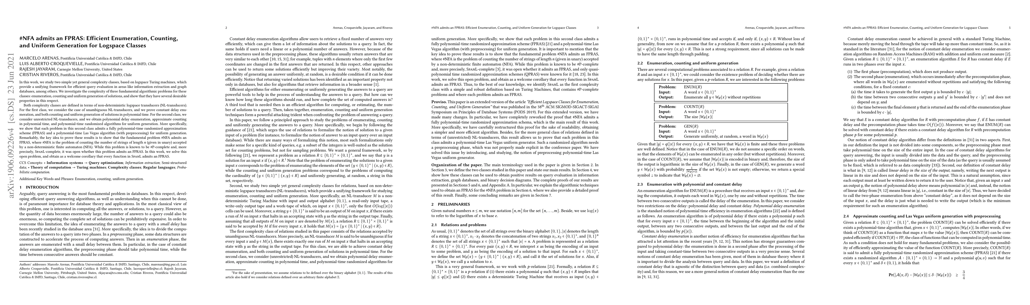 This research proves that the problem #NFA, which counts strings accepted by a non-deterministic finite automaton, admits a Fully Polynomial-Time Randomized Approximation Scheme (FPRAS). This resolves an open problem, implying every function in the complexity class SpanL also admits an FPRAS. The study defines two complexity classes based on unambiguous and unrestricted non-deterministic logspace transducers, demonstrating efficient enumeration, counting, and uniform generation of solutions for each class.