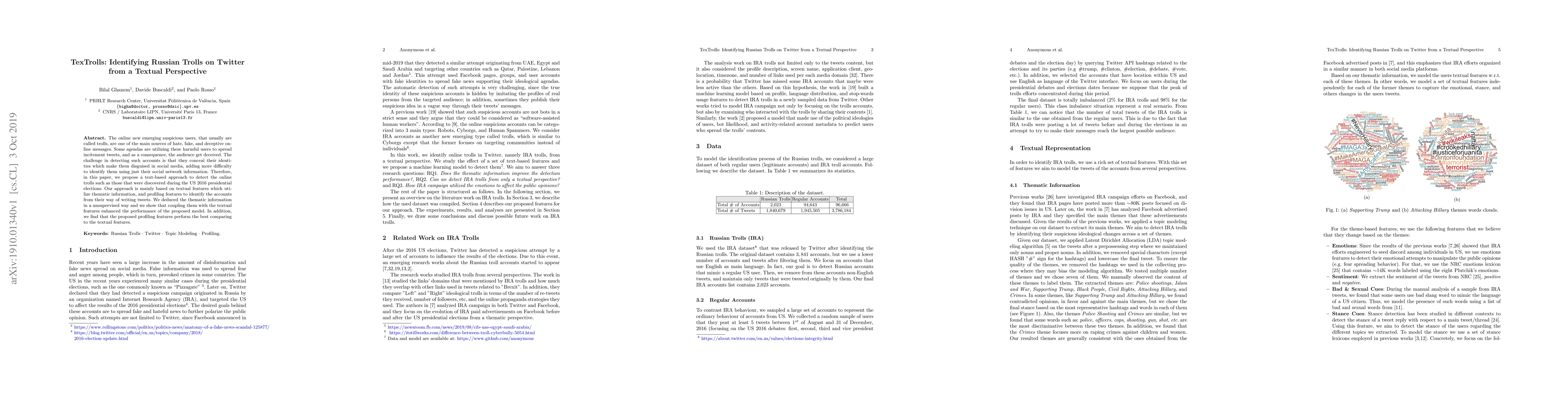 The online new emerging suspicious users, that usually are called trolls, are one of the main sources of hate, fake, and deceptive online messages. Some agendas are utilizing these harmful users to spread incitement tweets, and as a consequence, the audience get deceived. The challenge in detecting such accounts is that they conceal their identities which make them disguised in social media, adding more difficulty to identify them using just their social network information. Therefore, in this paper, we propose a text-based approach to detect the online trolls such as those that were discovered during the US 2016 presidential elections. Our approach is mainly based on textual features which utilize thematic information, and profiling features to identify the accounts from their way of writing tweets. We deduced the thematic information in a unsupervised way and we show that coupling them with the textual features enhanced the performance of the proposed model. In addition, we find that the proposed profiling features perform the best comparing to the textual features.