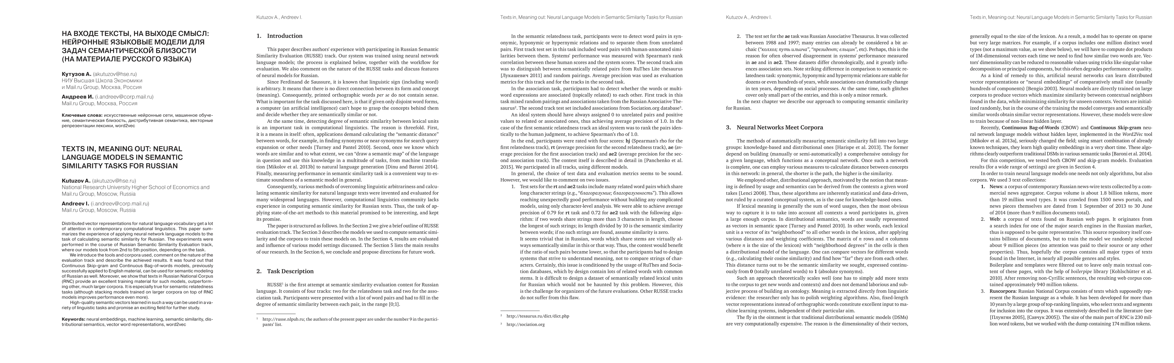 This paper explores the application of neural network language models to calculate semantic similarity for Russian, achieving notable results in the Russian Semantic Similarity Evaluation track. It demonstrates that the Russian National Corpus provides superior training material for these models compared to larger corpora, highlighting the potential for further linguistic applications.