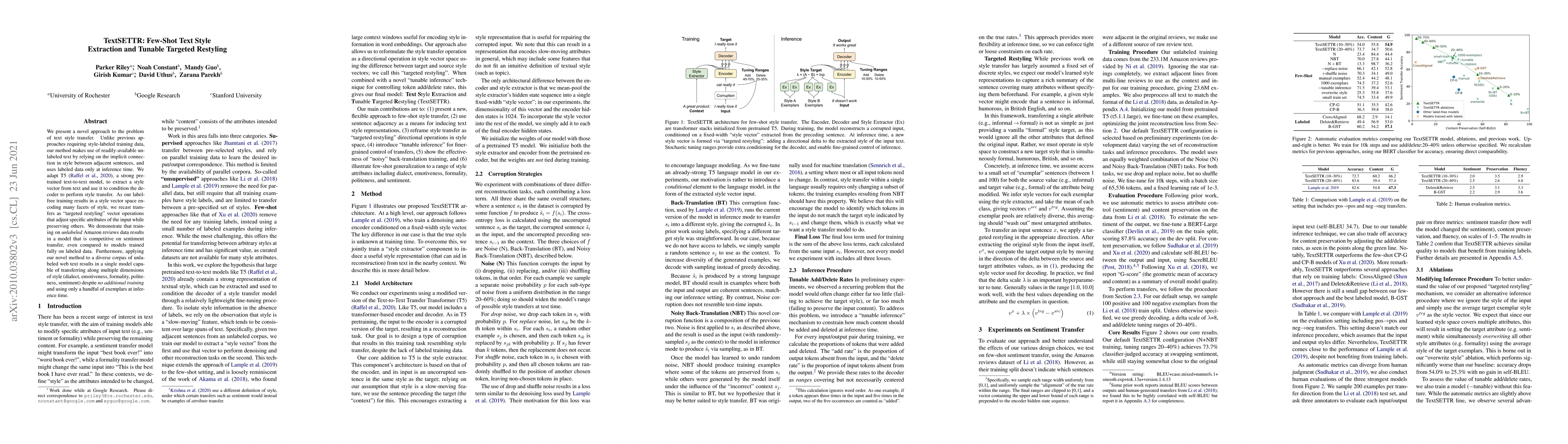 This paper introduces TextSETTR, a novel approach to text style transfer that uses unlabeled data to extract a style vector, allowing for targeted restyling with minimal training data. The method achieves competitive results on sentiment transfer and demonstrates the ability to adapt to multiple dimensions of style without additional training.