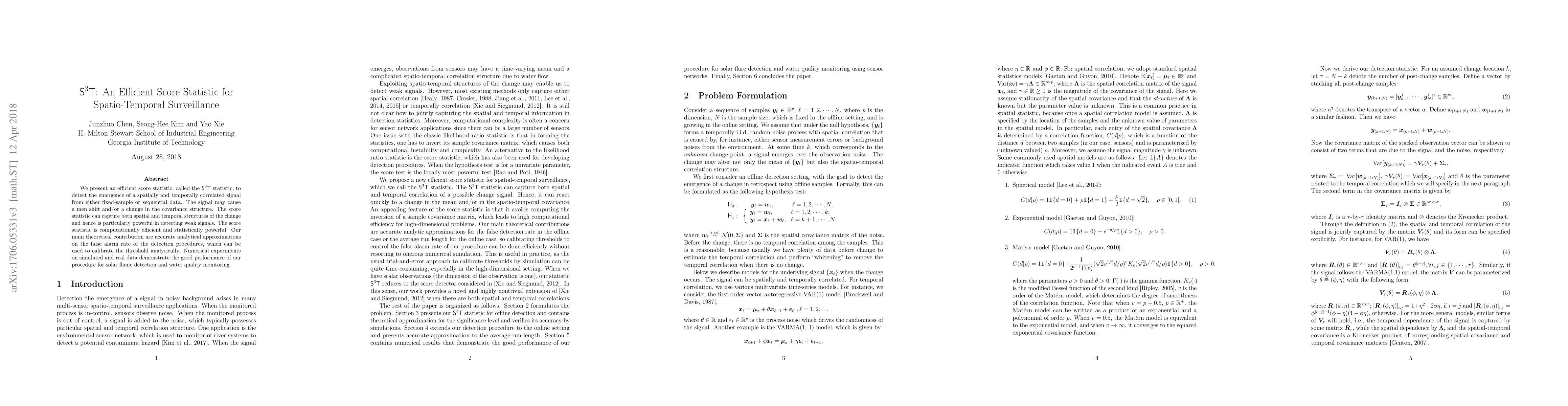 We present an efficient score statistic, called the $\textsf{S}^3 \textsf{T}$ statistic, to detect the emergence of a spatially and temporally correlated signal from either fixed-sample or sequential data. The signal may cause a men shift and/or a change in the covariance structure. The score statistic can capture both spatial and temporal structures of the change and hence is particularly powerful in detecting weak signals. The score statistic is computationally efficient and statistically powerful. Our main theoretical contribution are accurate analytical approximations on the false alarm rate of the detection procedures, which can be used to calibrate the threshold analytically. Numerical experiments on simulated and real data demonstrate the good performance of our procedure for solar flame detection and water quality monitoring.