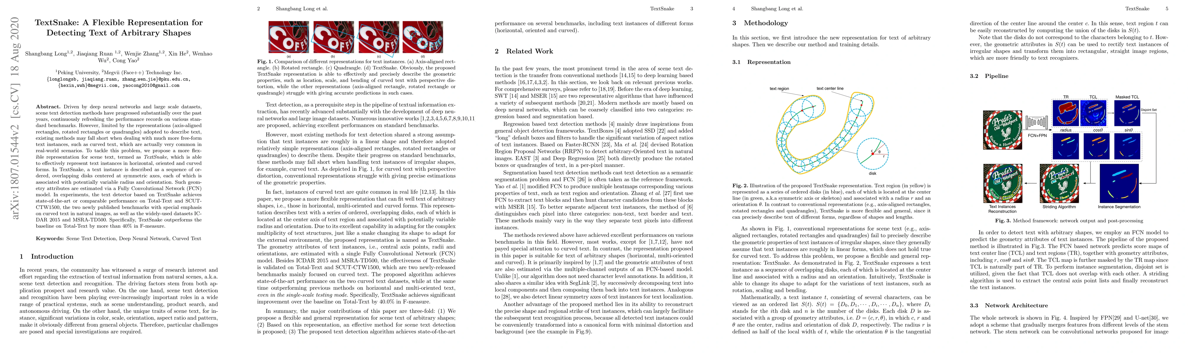 Researchers propose a new text detection method called TextSnake, which can detect curved and irregularly shaped text in images, achieving state-of-the-art performance on several benchmark datasets.