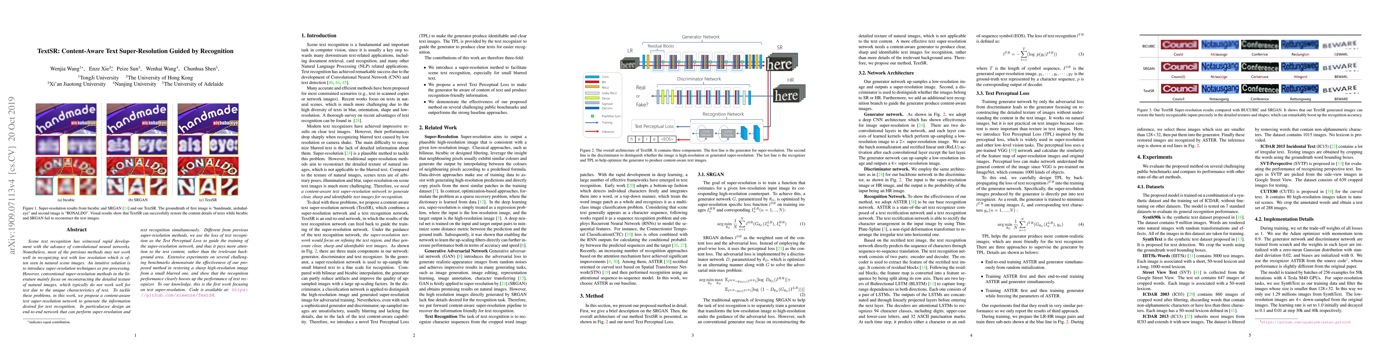 This paper proposes a content-aware text super-resolution network that integrates text recognition into the super-resolution process to improve text clarity in low-resolution images. The method uses a Text Perceptual Loss based on recognition loss to guide super-resolution, enhancing text details while ignoring irrelevant background, leading to improved recognition performance.