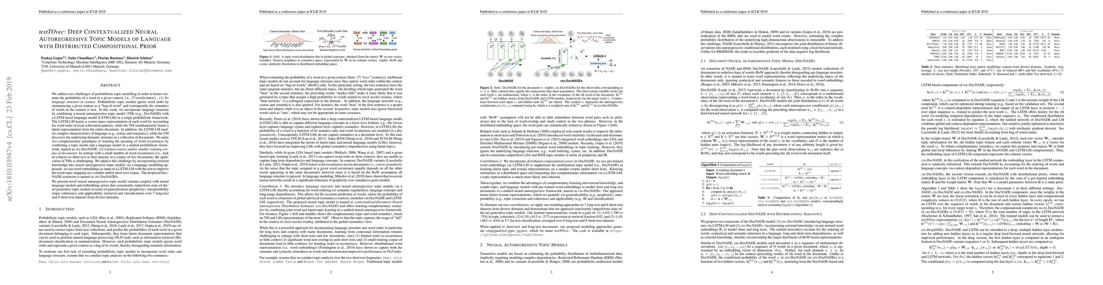 The paper introduces textTOvec, a deep contextualized neural autoregressive topic model that combines language modeling and topic modeling to better capture word semantics in context. It addresses the challenges of language structure loss and context sparsity, achieving superior performance in generalization, interpretability, and applicability across various text datasets.