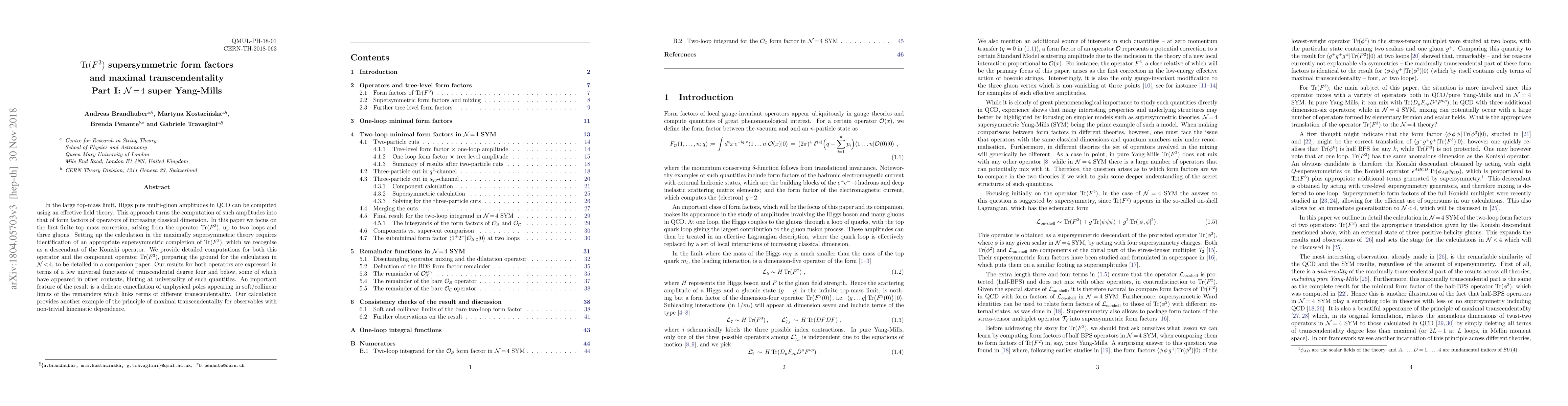 In the large top-mass limit, Higgs plus multi-gluon amplitudes in QCD can be computed using an effective field theory. This approach turns the computation of such amplitudes into that of form factors of operators of increasing classical dimension. In this paper we focus on the first finite top-mass correction, arising from the operator ${\rm Tr}(F^3)$, up to two loops and three gluons. Setting up the calculation in the maximally supersymmetric theory requires identification of an appropriate supersymmetric completion of ${\rm Tr}(F^3)$, which we recognise as a descendant of the Konishi operator. We provide detailed computations for both this operator and the component operator ${\rm Tr}(F^3)$, preparing the ground for the calculation in $\mathcal{N}<4$, to be detailed in a companion paper. Our results for both operators are expressed in terms of a few universal functions of transcendental degree four and below, some of which have appeared in other contexts, hinting at universality of such quantities. An important feature of the result is a delicate cancellation of unphysical poles appearing in soft/collinear limits of the remainders which links terms of different transcendentality. Our calculation provides another example of the principle of maximal transcendentality for observables with non-trivial kinematic dependence.