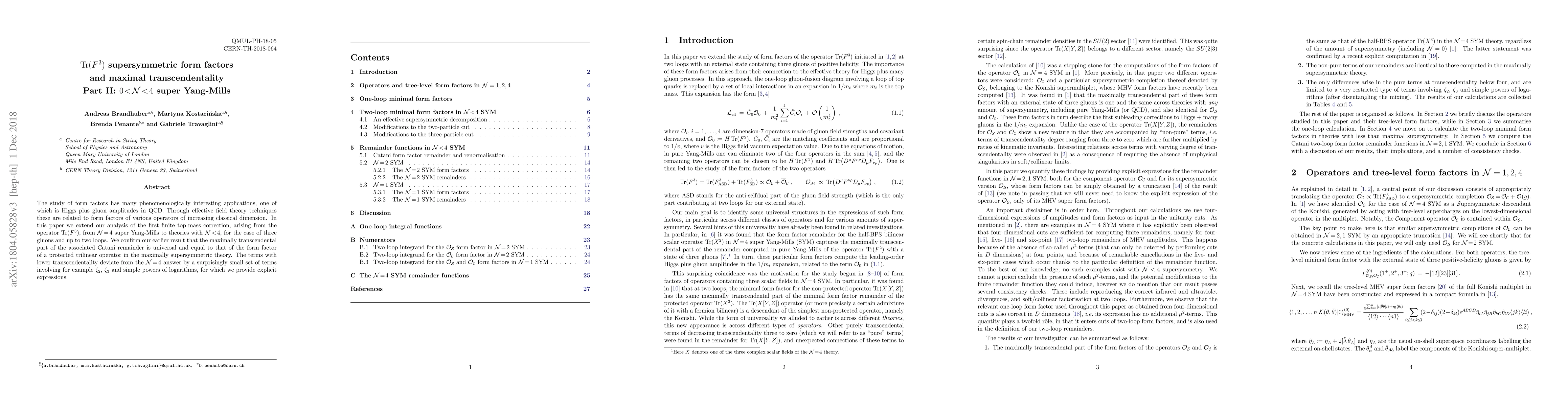 The study of form factors has many phenomenologically interesting applications, one of which is Higgs plus gluon amplitudes in QCD. Through effective field theory techniques these are related to form factors of various operators of increasing classical dimension. In this paper we extend our analysis of the first finite top-mass correction, arising from the operator ${\rm Tr} (F^3)$, from $\mathcal{N}=4$ super Yang-Mills to theories with $\mathcal{N}<4$, for the case of three gluons and up to two loops. We confirm our earlier result that the maximally transcendental part of the associated Catani remainder is universal and equal to that of the form factor of a protected trilinear operator in the maximally supersymmetric theory. The terms with lower transcendentality deviate from the $\mathcal{N}=4$ answer by a surprisingly small set of terms involving for example $\zeta_2$, $\zeta_3$ and simple powers of logarithms, for which we provide explicit expressions.