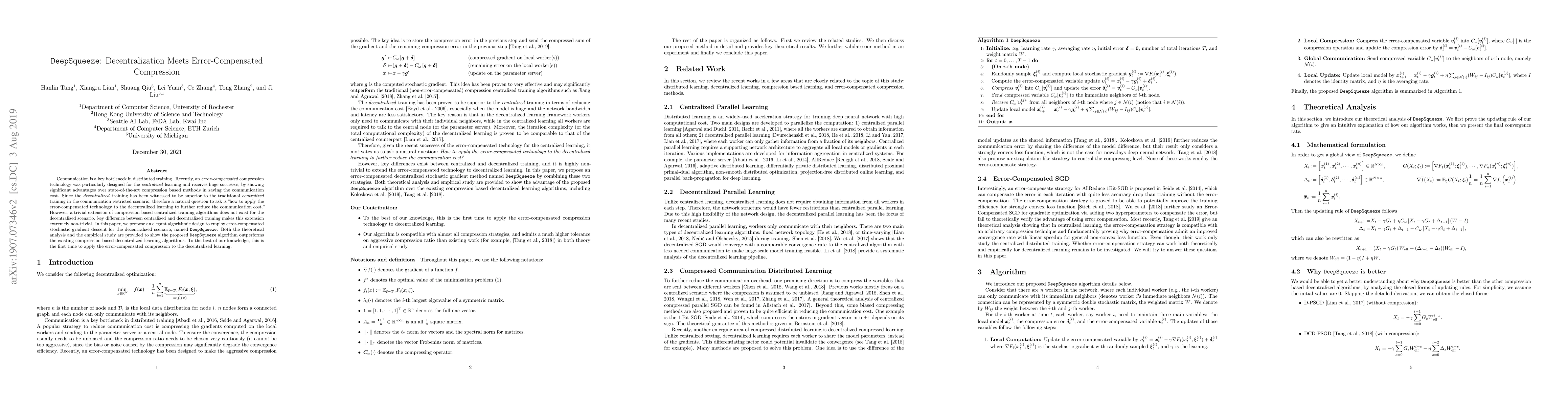 The paper proposes $\texttt{DeepSqueeze}$, a novel algorithm that applies error-compensated compression to decentralized training, significantly reducing communication costs compared to existing methods. Both theoretical analysis and empirical studies demonstrate its superior performance.