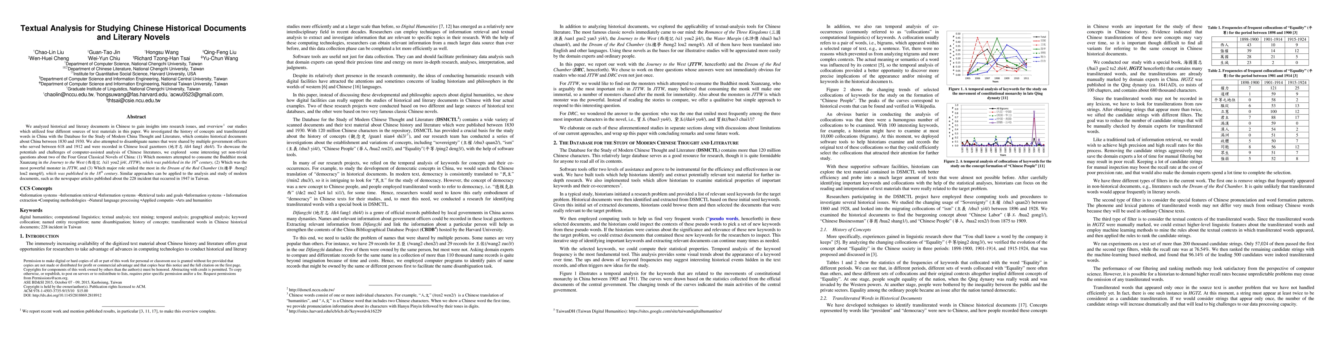 This paper analyzes historical and literary texts in Chinese to explore research issues, utilizing four different text sources. It investigates concepts and transliterated words from 1830-1930 documents and disambiguates names from local gazetteers. It also explores questions from two classical novels, demonstrating the potential and challenges of computer-assisted analysis of Chinese literature.