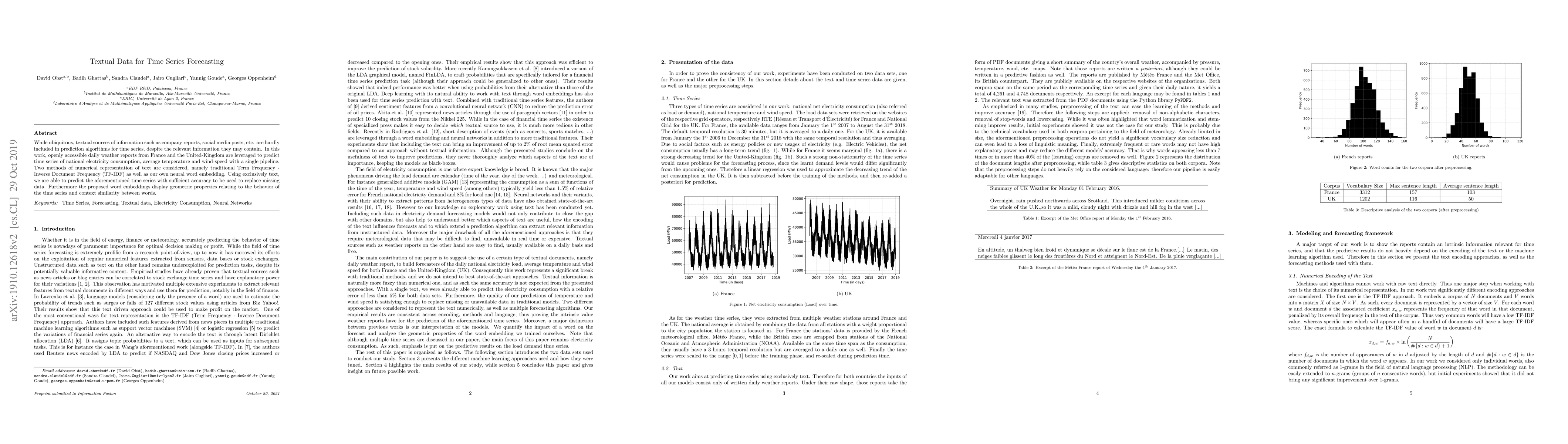While ubiquitous, textual sources of information such as company reports, social media posts, etc. are hardly included in prediction algorithms for time series, despite the relevant information they may contain. In this work, openly accessible daily weather reports from France and the United-Kingdom are leveraged to predict time series of national electricity consumption, average temperature and wind-speed with a single pipeline. Two methods of numerical representation of text are considered, namely traditional Term Frequency - Inverse Document Frequency (TF-IDF) as well as our own neural word embedding. Using exclusively text, we are able to predict the aforementioned time series with sufficient accuracy to be used to replace missing data. Furthermore the proposed word embeddings display geometric properties relating to the behavior of the time series and context similarity between words.